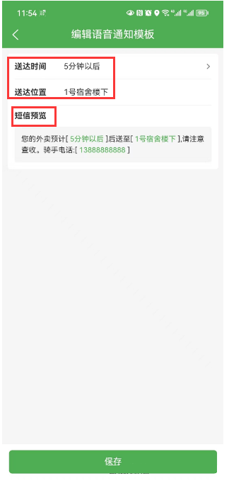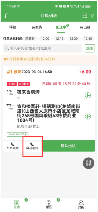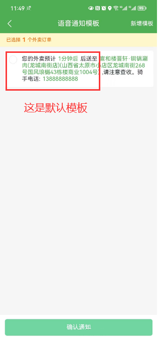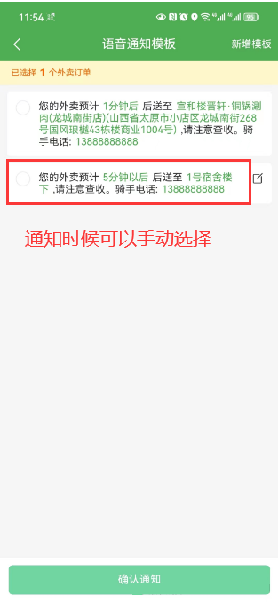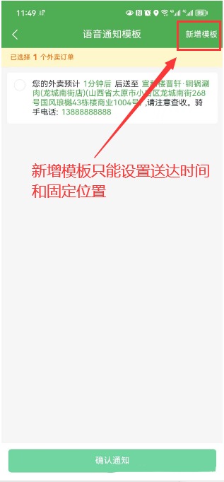 配送员在订单列表或者订单详情页手动点击通知,可以新增模板