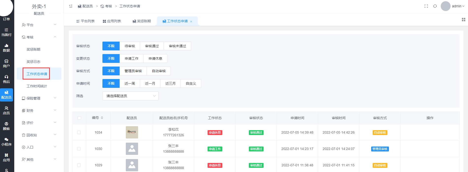 总平台设置-配送员-配送规则,设置配送员申请工作/休息是否需要审核,是否开启工作时间统计