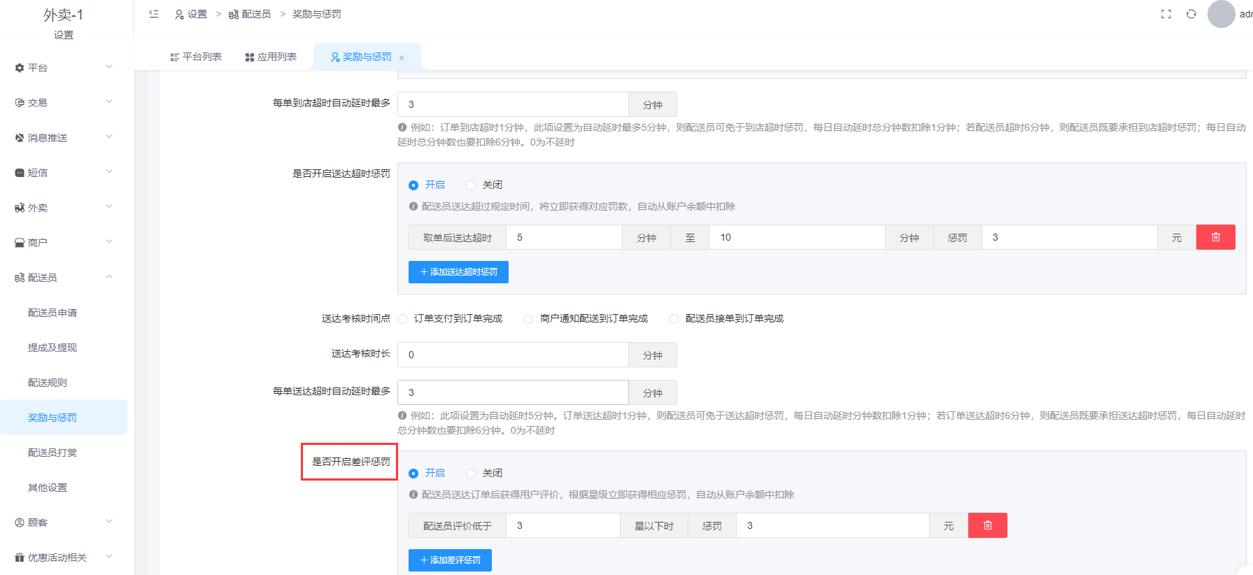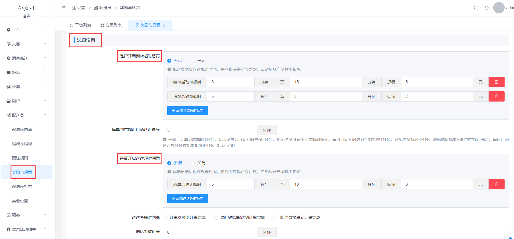 惩罚设置: 到店超时惩罚、送达超时惩罚、差评惩罚