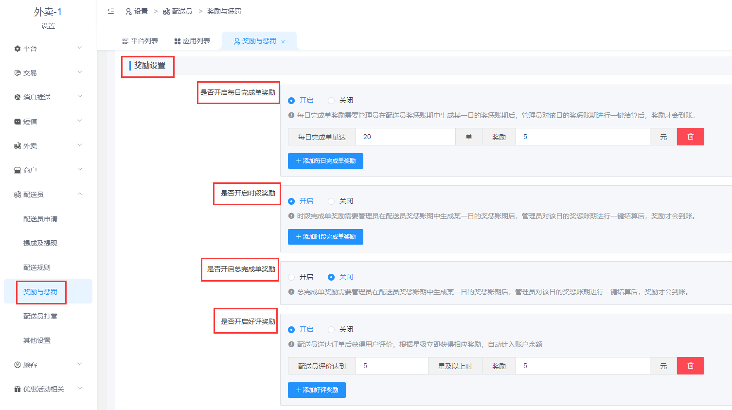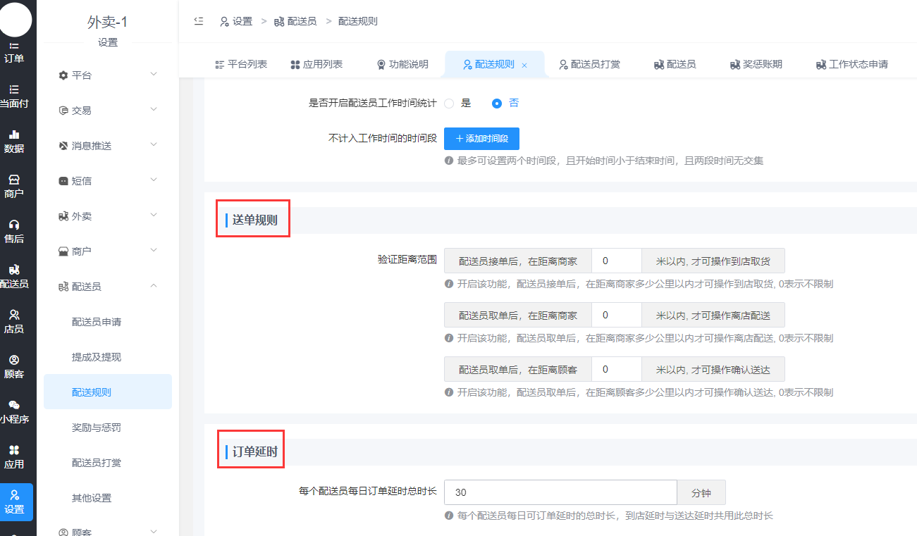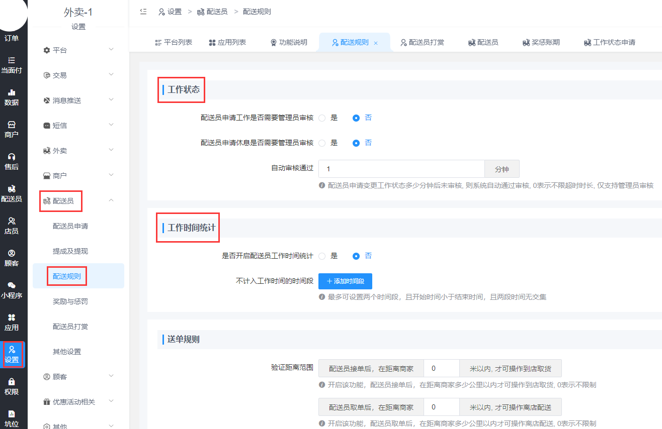 >[info] **功能: 主要用于设置配送员变更工作状态是否需要管理员审核,配送到店、取货、送达是否需要验证配送距离,每日配送订单总数达到一定数量时是否开启奖励、配送订单总数达到一定数量时是否开启奖励、是否开启好评奖励和差评惩罚、是否开启到店超时和送达超时惩罚等.**