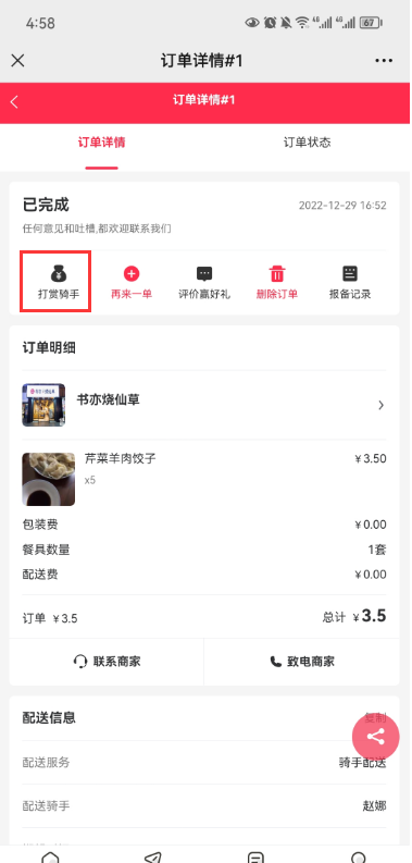 顾客端订单详情里可以打赏骑手