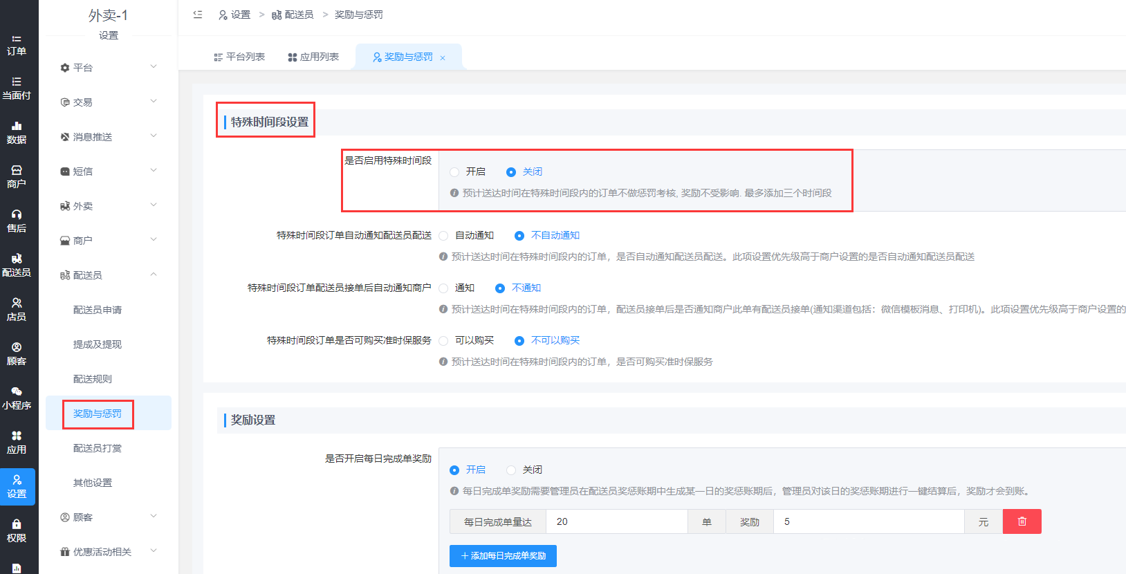 是否启用特殊时间段设置,预计送达时间在特殊时间段内的订单不做惩罚考核,奖励不受影响。