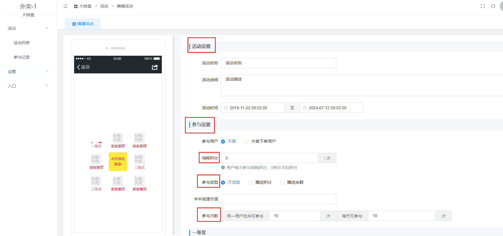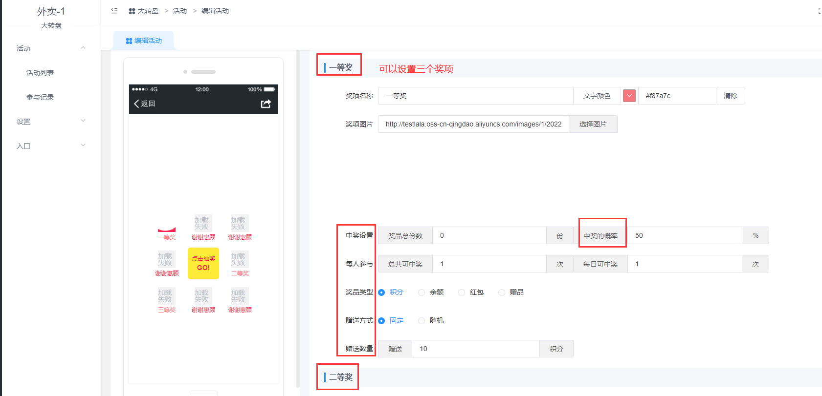 >[danger]**注意: 这里对应选择后,顾客下单支付后才可以弹出大转盘抽奖。且只有下单支付后可以弹出直接用大转盘链接进入不能抽奖的。**