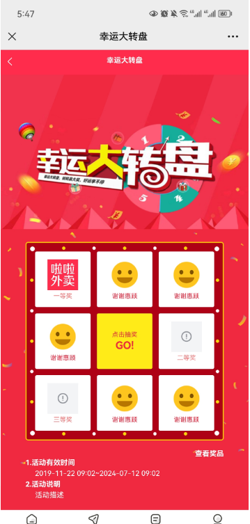 >[info] **功能: 顾客下单支付后可以弹出大转盘抽奖,可以设置三个奖项**