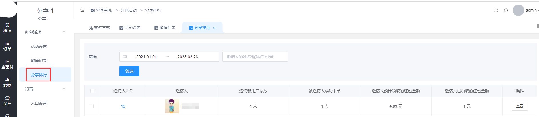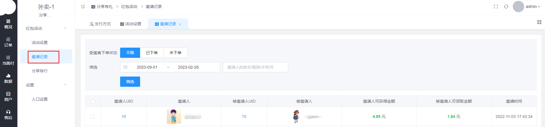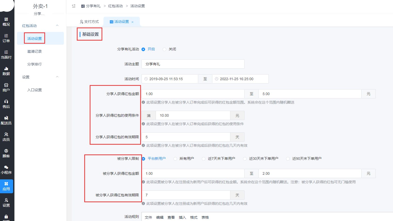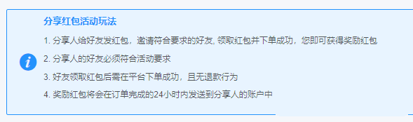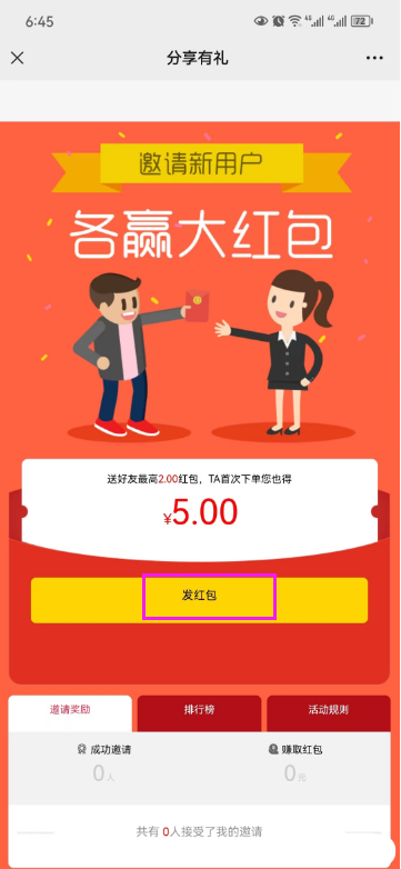>[info] 功能:分享人给好友发红包,邀请好友成为平台新用户,好友领取红包并完成首单,被分享人也可获得奖励红包,且分享人的好友必须是从未使用过平台的新用户;适用场景: 推广平台邀请新用户进平台下单。(容易被微信封号,谨慎使用哦)