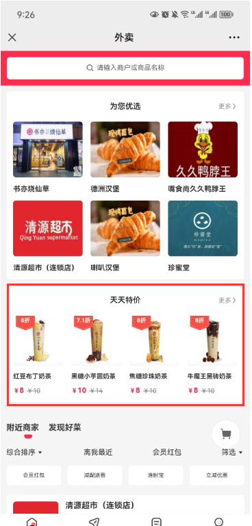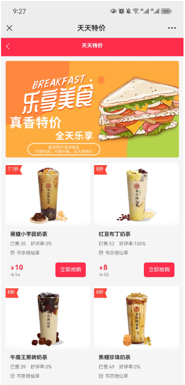 可以通过直接链接进入天天特价活动,也可以从默认首页或者自定义页面显示特价活动。