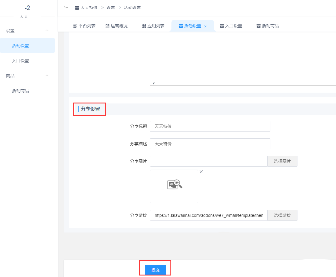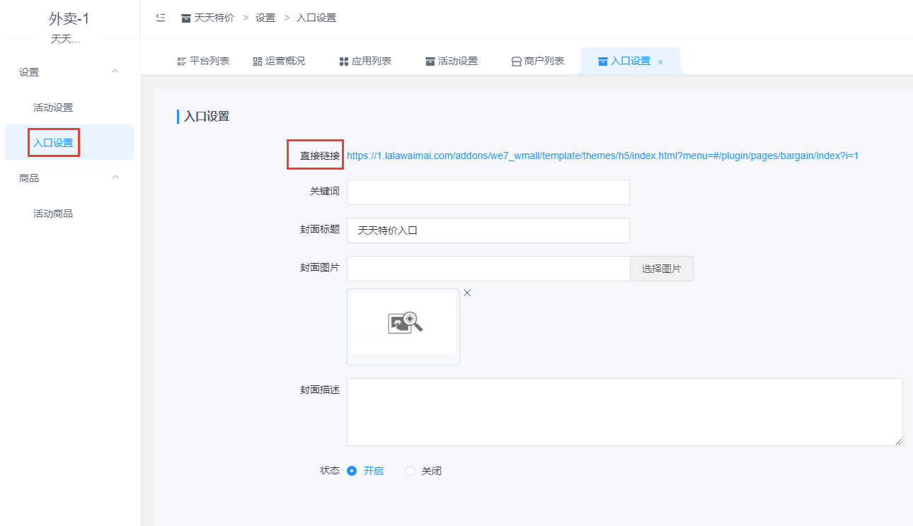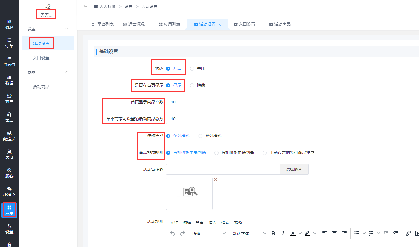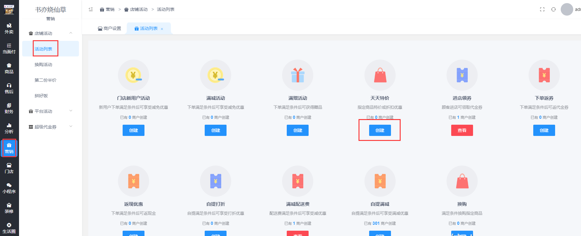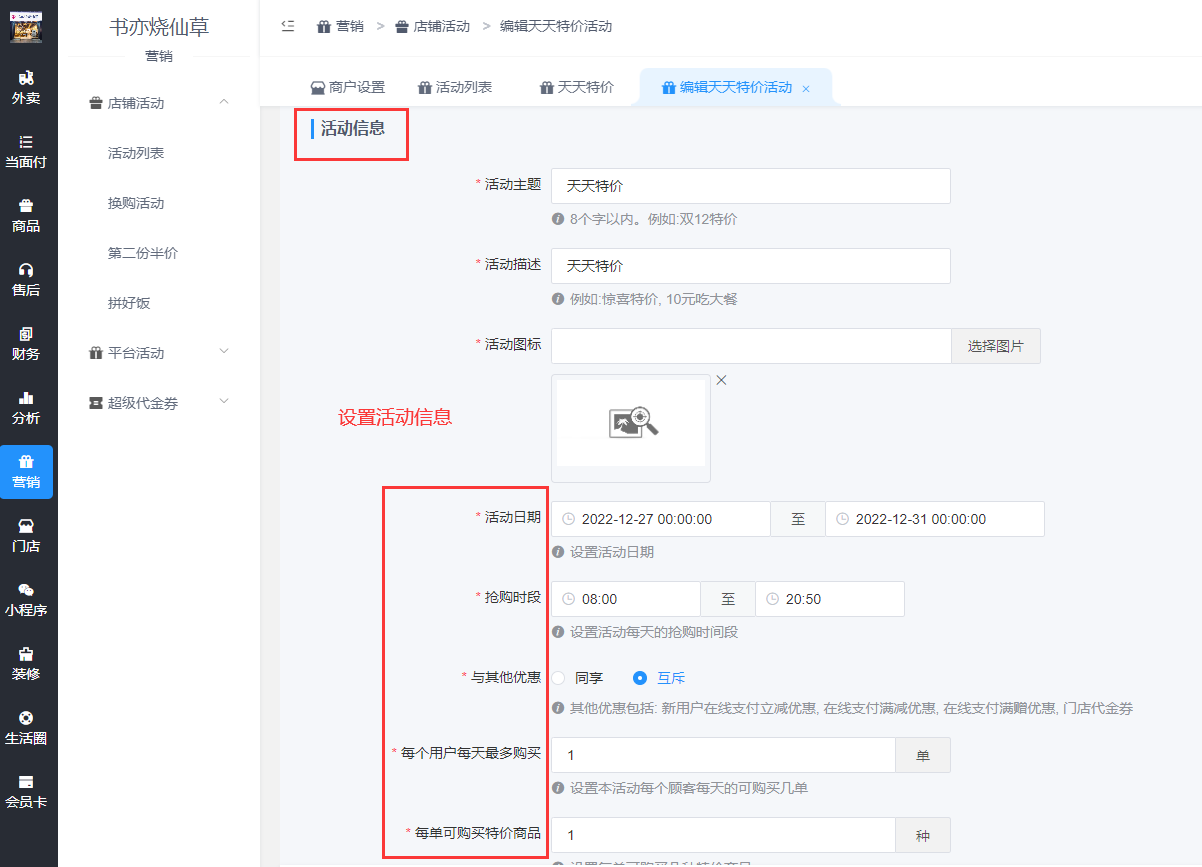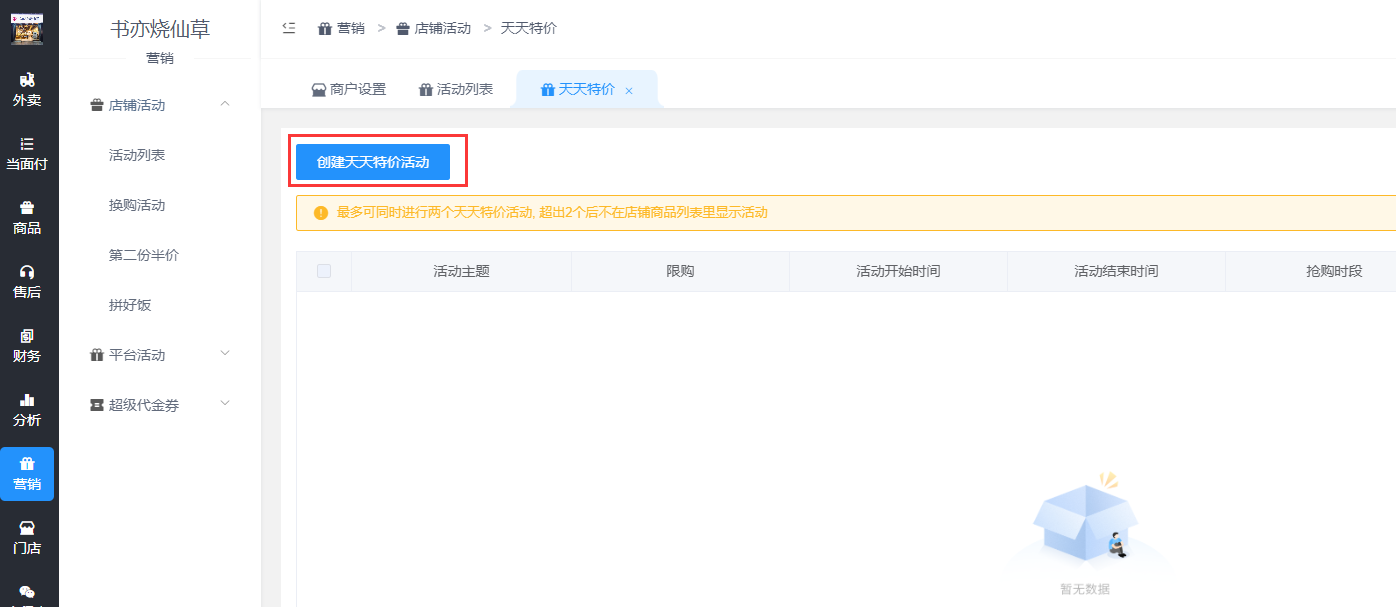 进入商户后台,营销-店铺活动-活动列表-天天特价