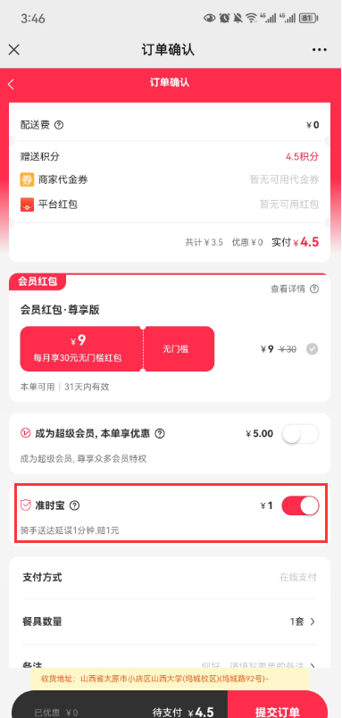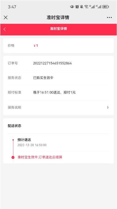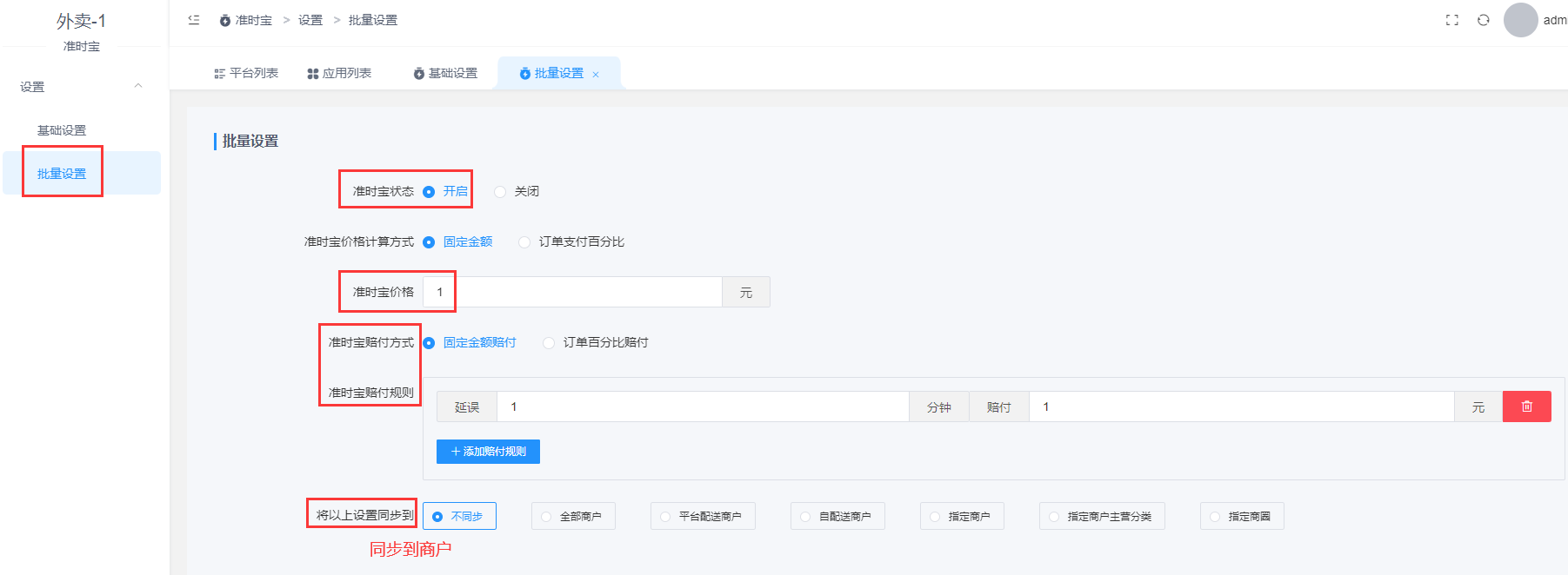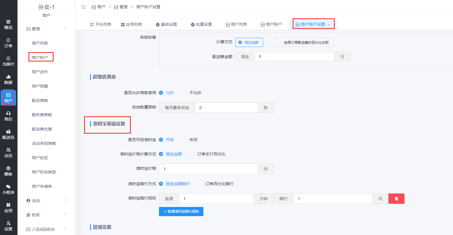 >[info]**功能: 开启商户准时宝,用户下单时可以购买准时宝,订单配送超时获得赔付资格,然后由平台发起赔付**