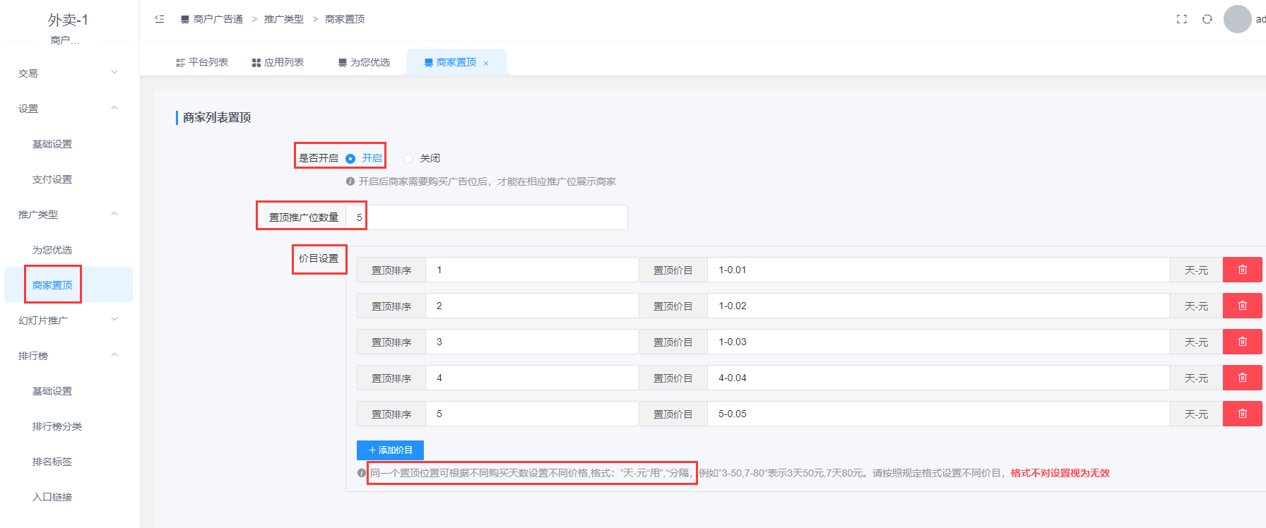 开启商家置顶广告位,商户购买广告位后是自动置顶的