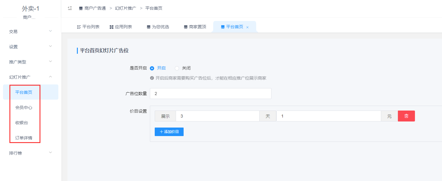 有平台首页、会员中心收银台和订单详情四种幻灯片推广,商家购买广告位后需要平台管理员手动在后台添加幻灯片