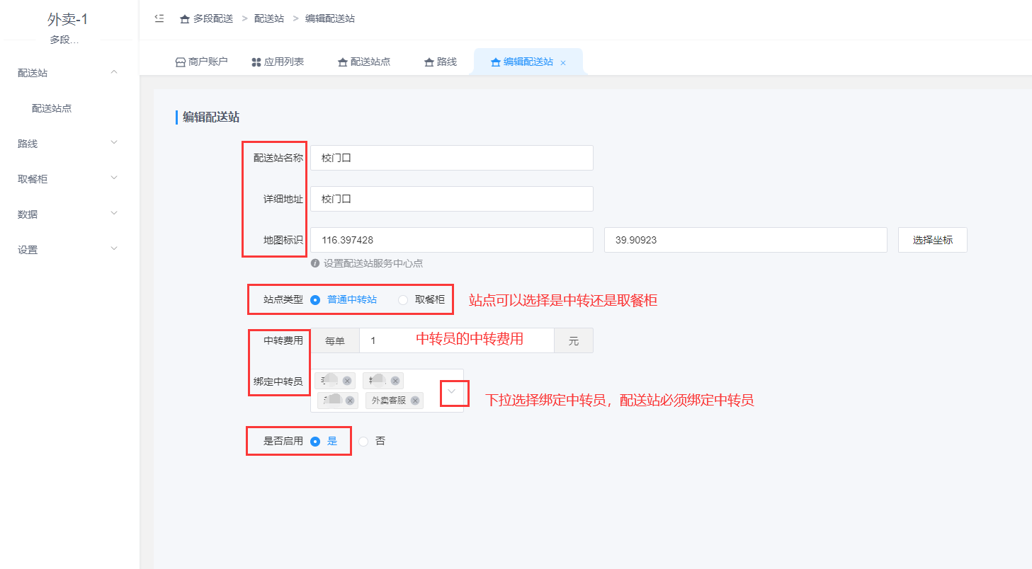 >[danger]注意:配送站必须绑定中转员