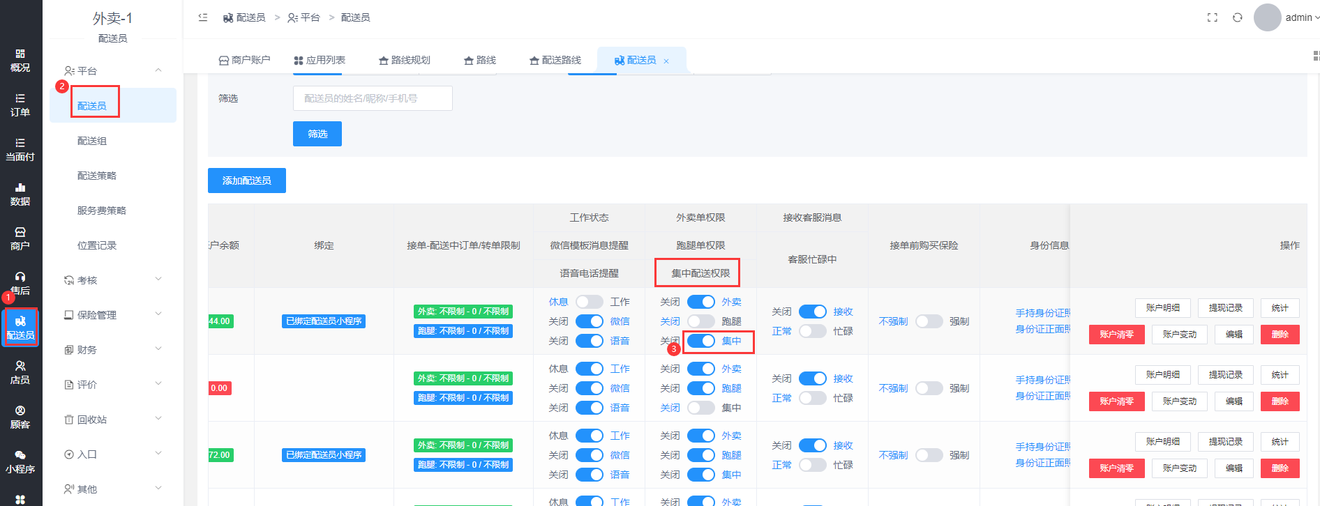 给配送员开启集中配送权限,有两种方法: 1.批量设置,2.单独给某个配送员设置