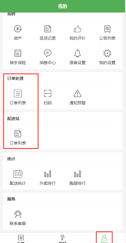 进入配送端我的页面,订单处理的订单列表和配送站的订单列表(绑定成为中转员才会显示配送站)