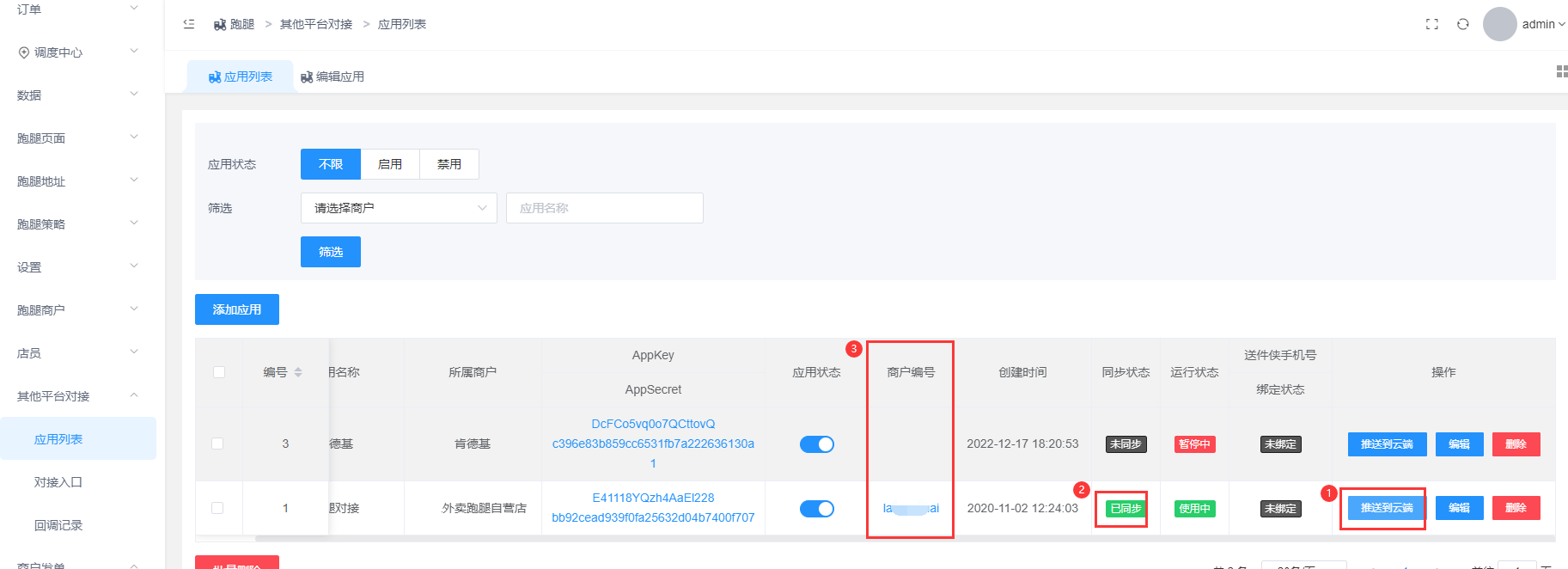 点击推送到云端,同步状态,然后获取商户编号.注意: 商户发单的基础设置状态需要开启,如下第3.1点