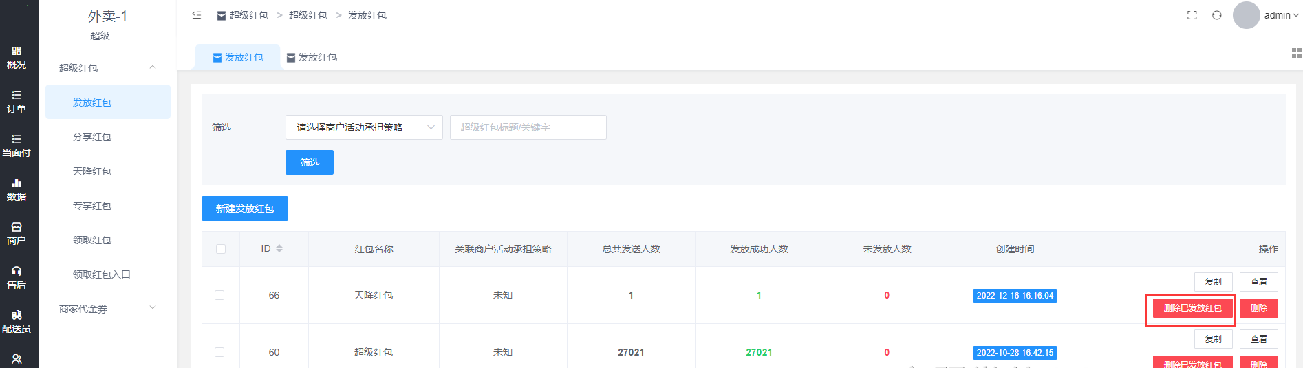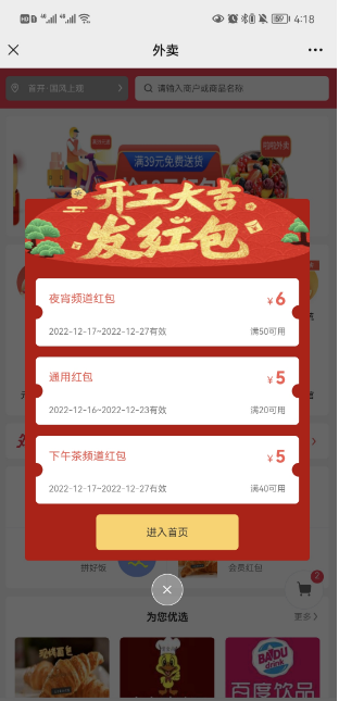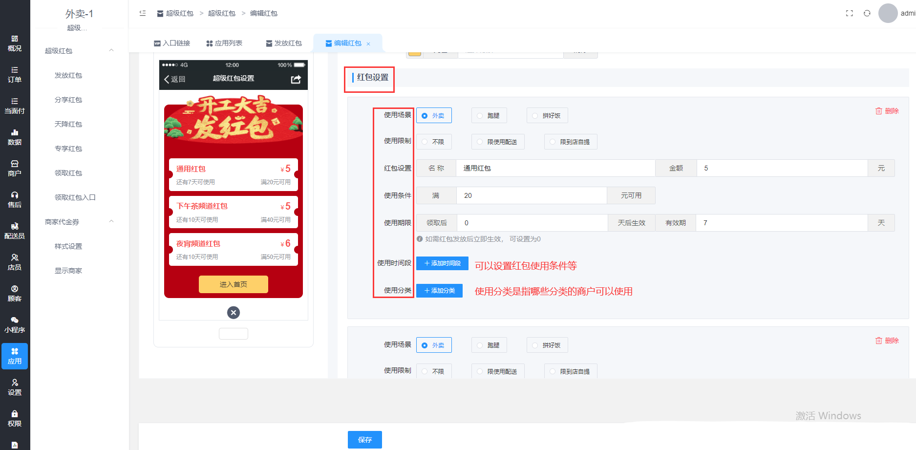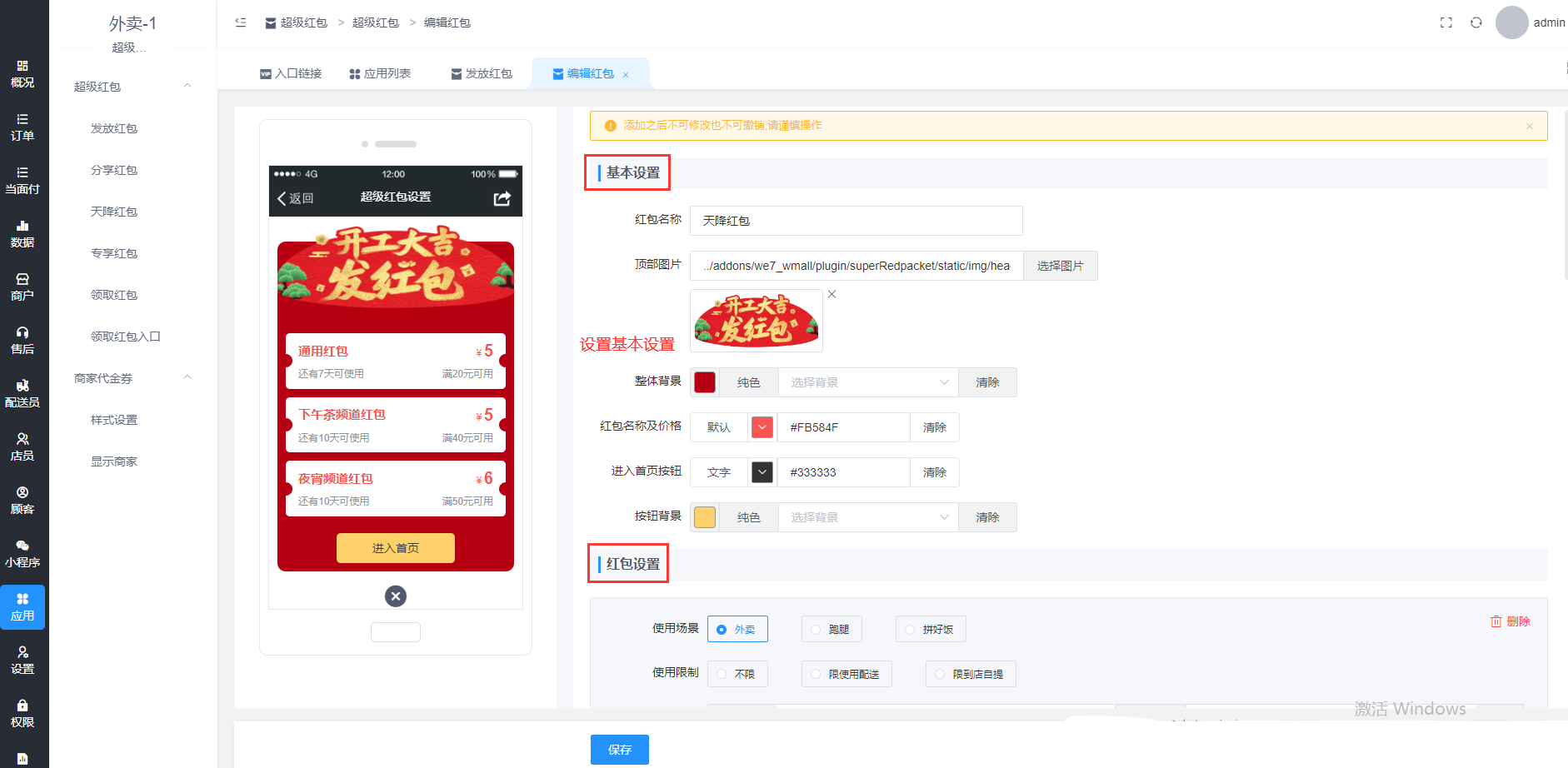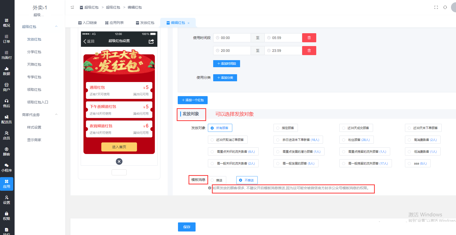 >[danger] 特别注意: 若使用了自定义页面的话,自定义页面里需要添加超级红包组件.发放红包后只有第一次进入平台首页才会弹出提示,红包不需要领取,自动进入顾客的红包账
