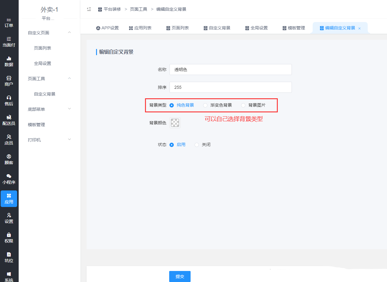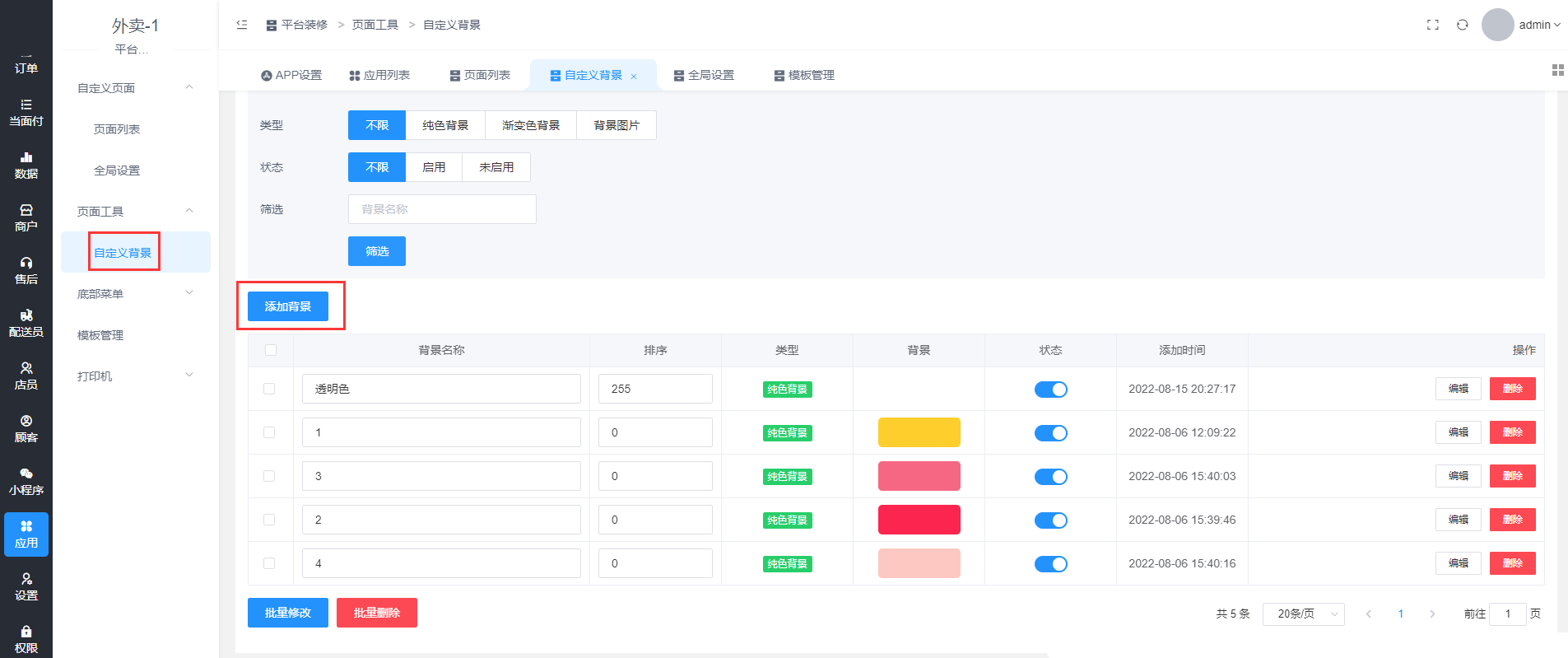 页面工具-自定义背景-添加背景,在自定义页面里可以选择使用背景颜色