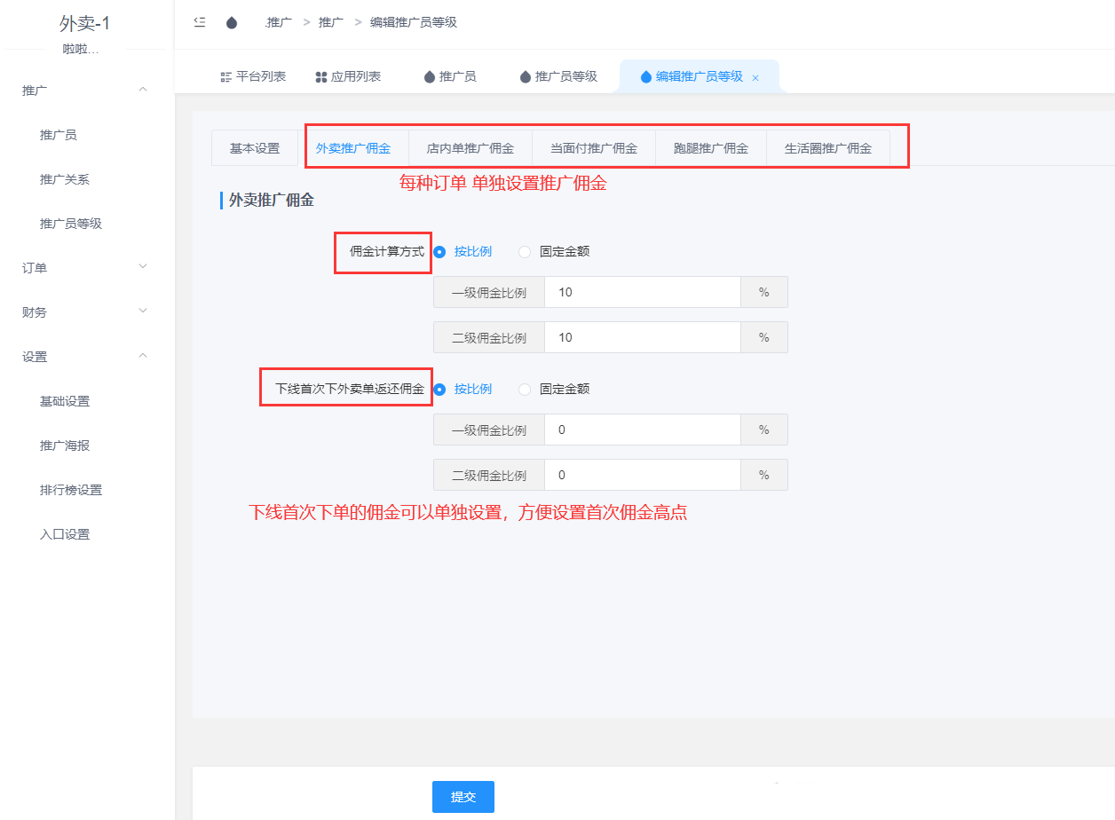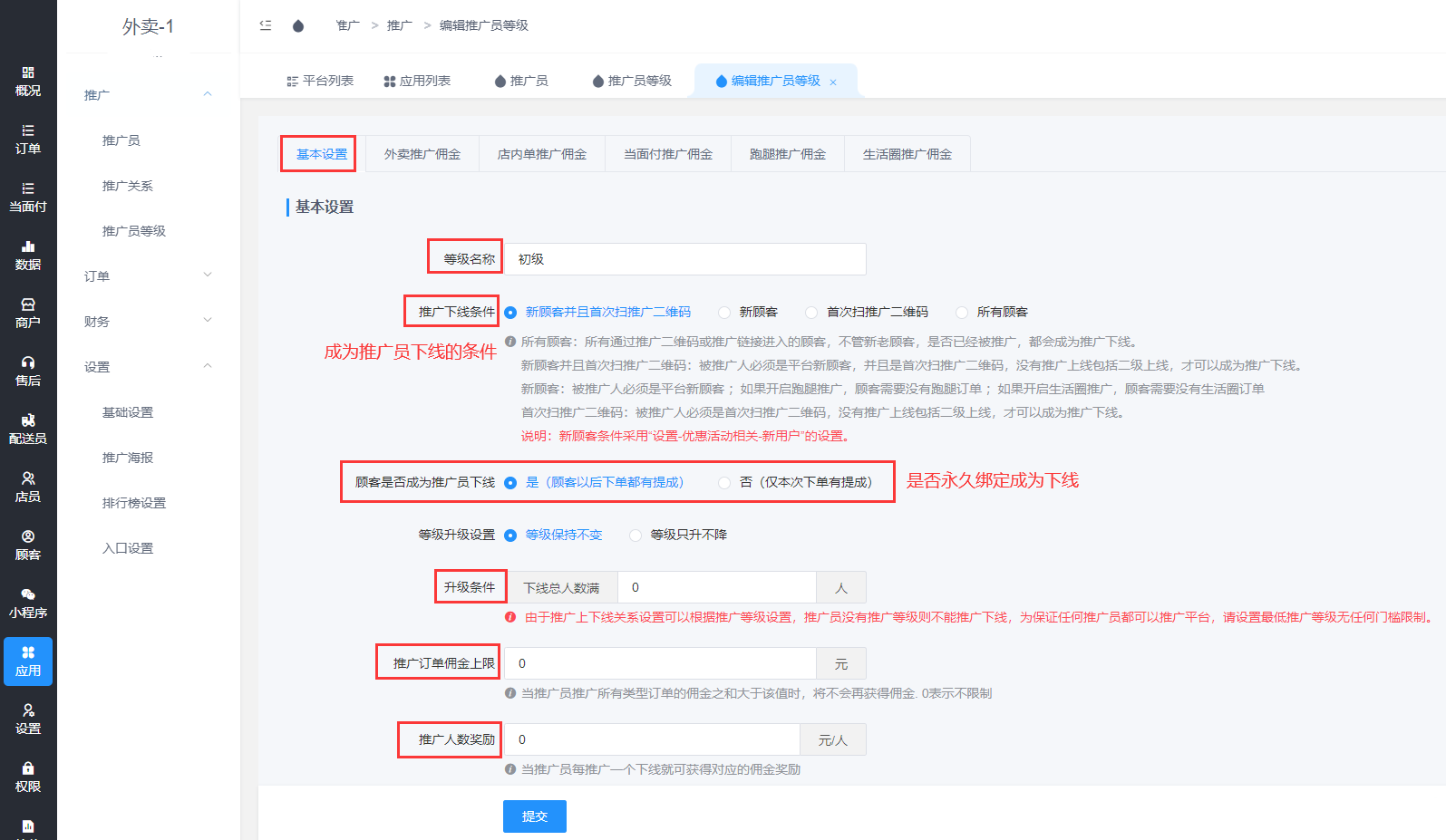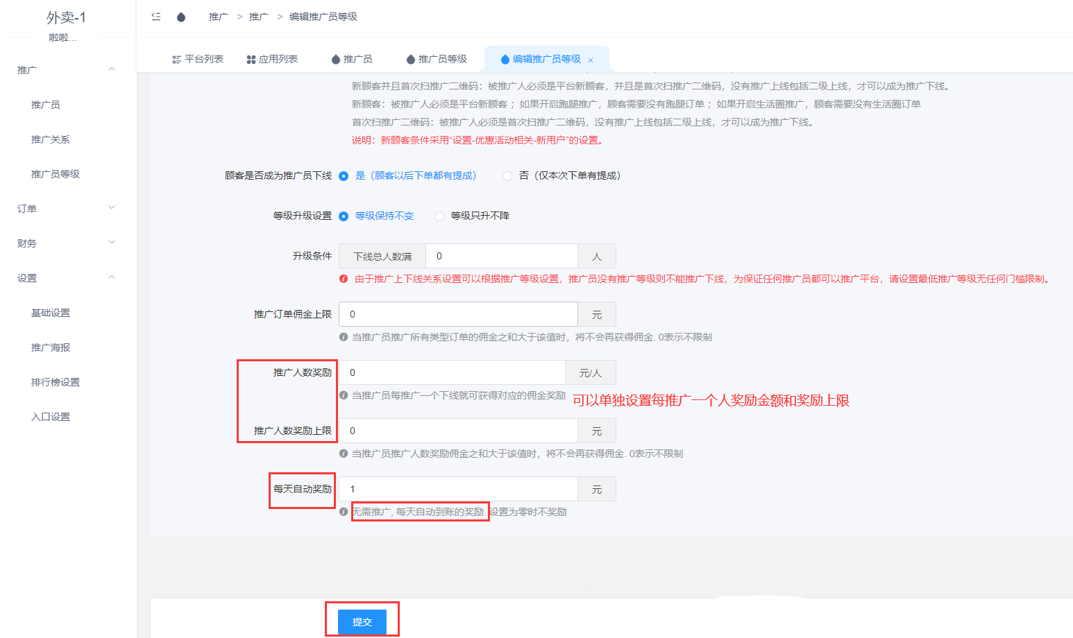 >[danger]注意:推广员没有推广等级则不能推广下线,为保证任何推广员都可以推广平台,请设置最低推”等级无任何门槛限制。