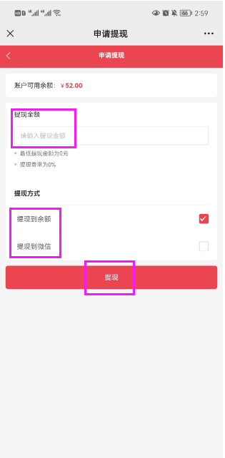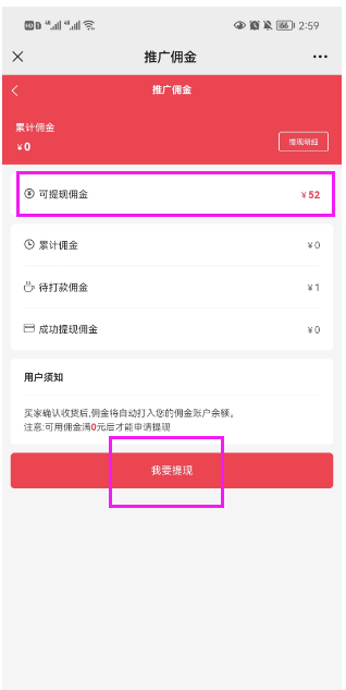 ## **1.1 公众号小程序里申请提现**