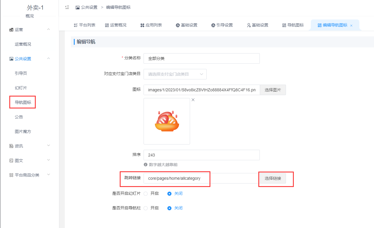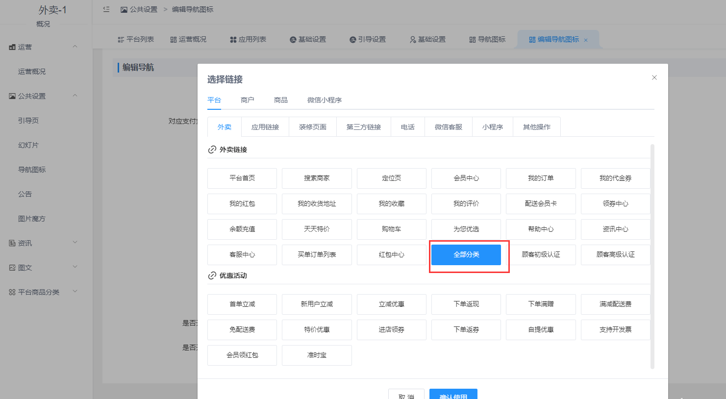 # **2.在首页导航图标或图片魔方等设置跳转全部分类页面**