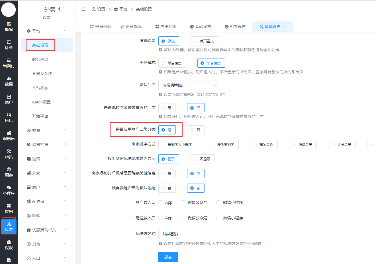 总后台设置-基础设置,启用商户二级分类