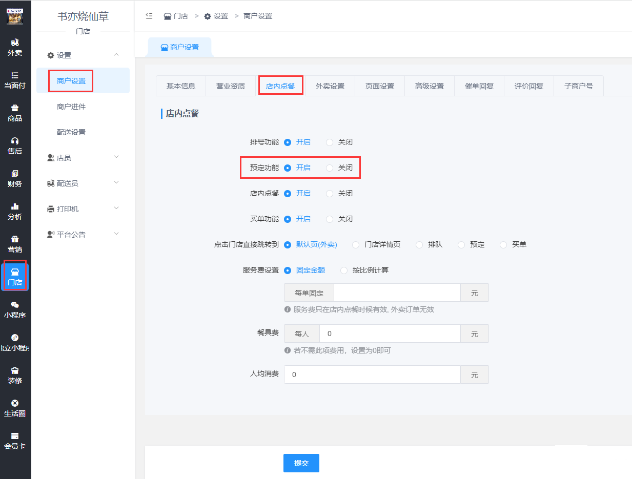 进入门店后台,门店-商户设置-店内点餐,开启预定功能