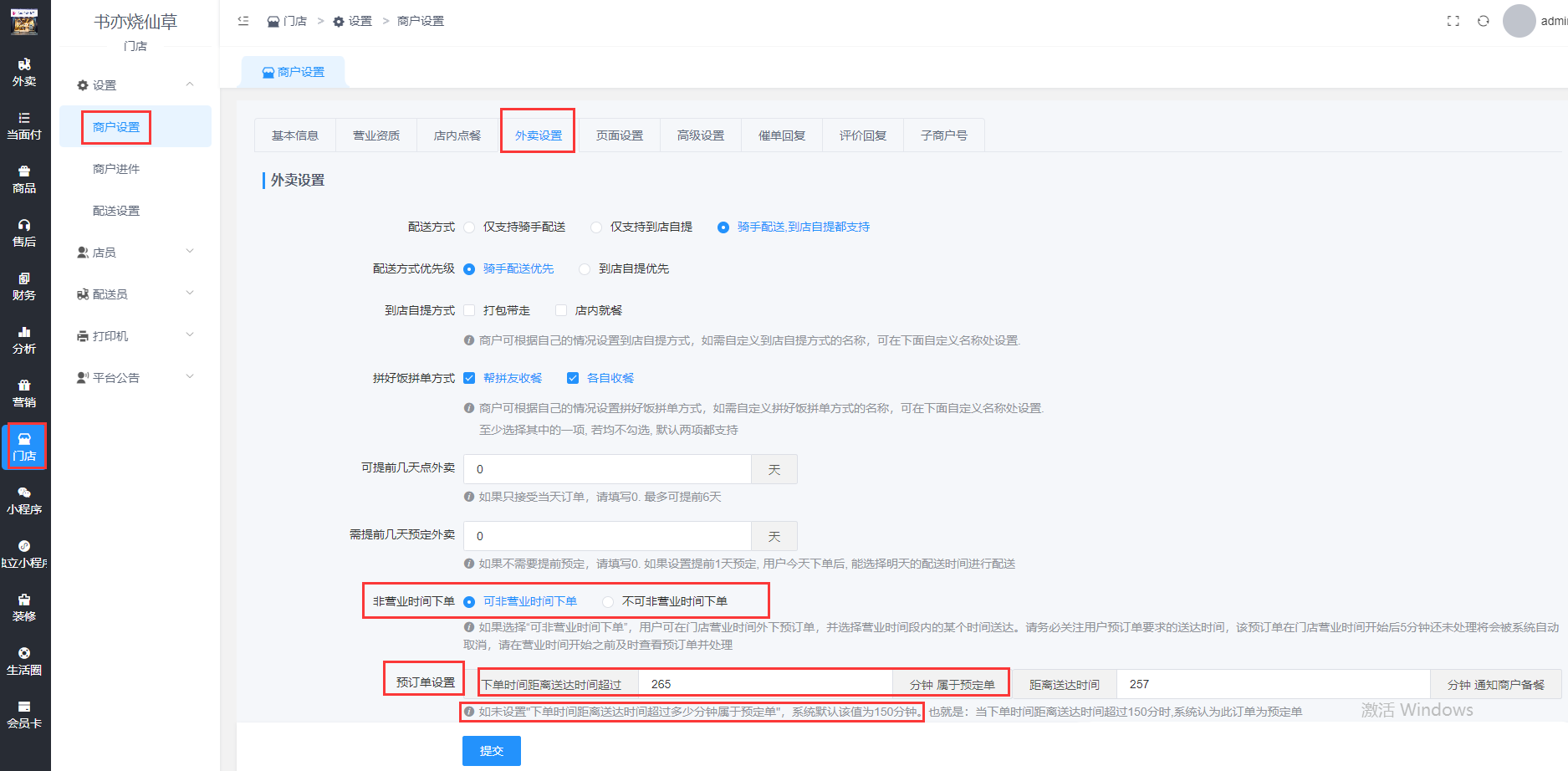 进入商户后台,门店-商户设置-外卖设置,设置可非营业时间下单