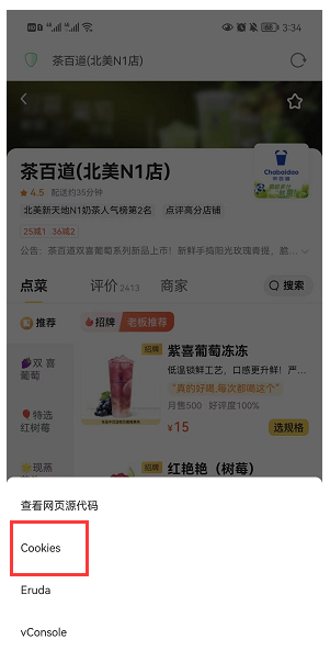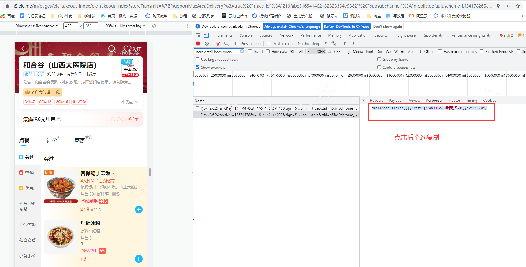 在浏览器中访问[饿了么H5链接](https://h5.ele.me/login/?redirect=https%3A%2F%2Fh5.ele.me%2Fminisite%2F%3Fspm%3Da2ogi.13147251.0.0&spm-pre=a2ogi.13147251.0.0&spm=a2f6g.12507204.ebridge.login)点击F12,打开调试模式,如下图。选择XHR,搜索store.detail.body.query,选中一个链接点击Response