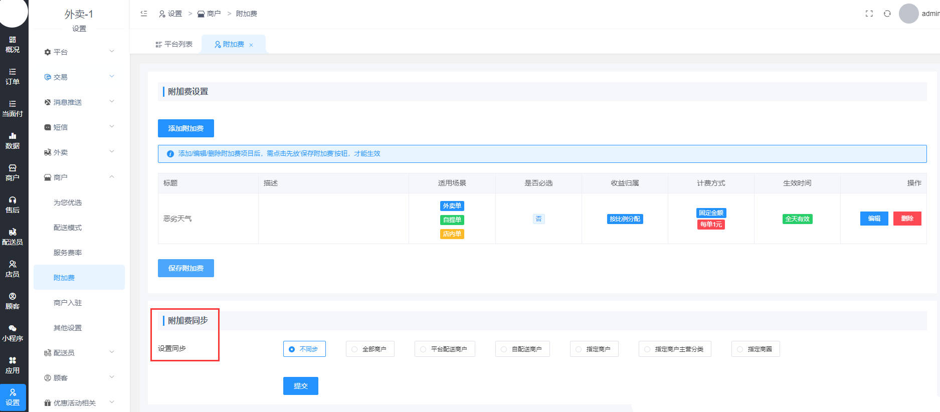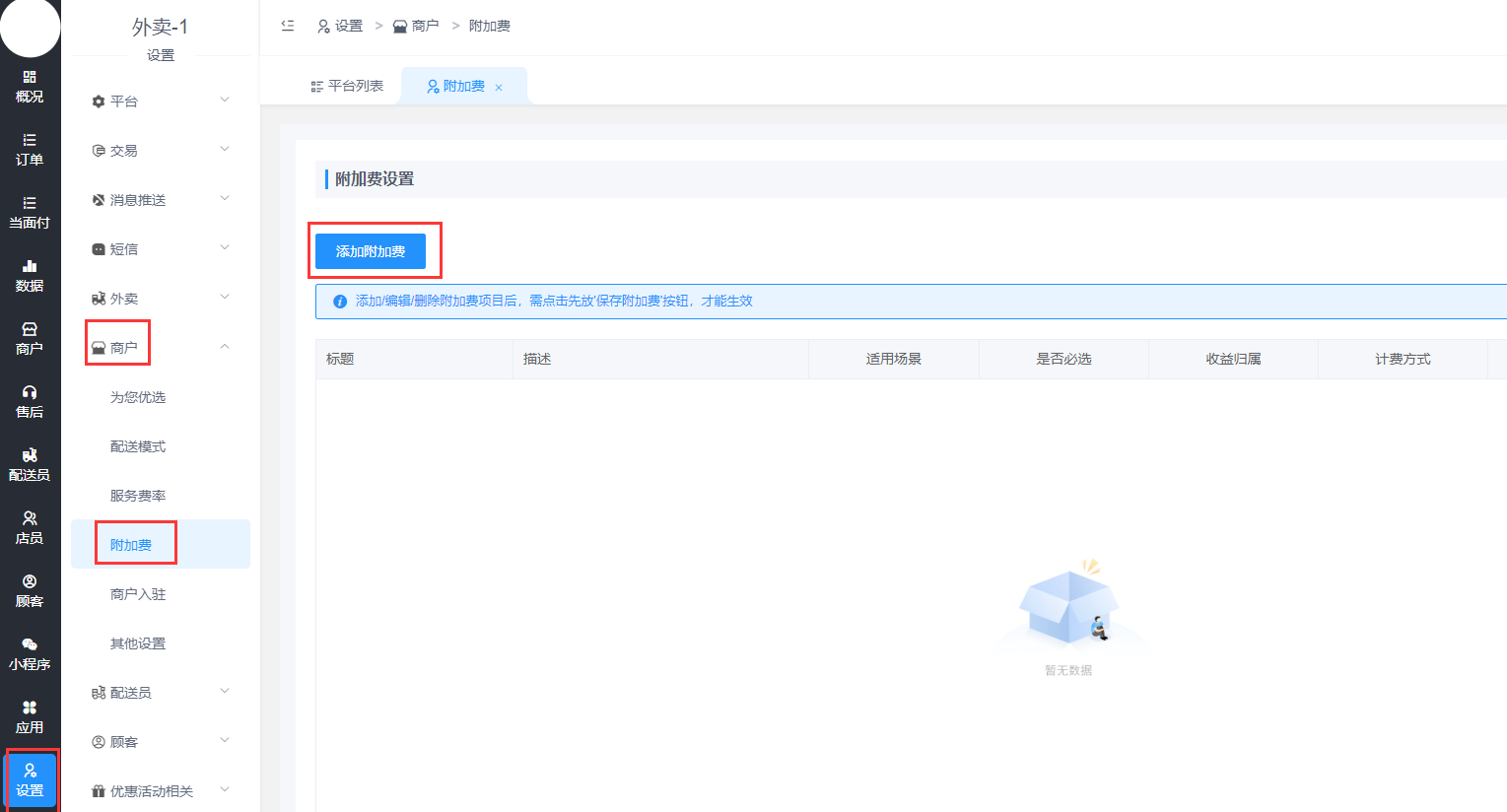 设置-商户-附加费-添加附加费,可以自定义设置附加费,设置是否必选、收益归属和生效时间始。