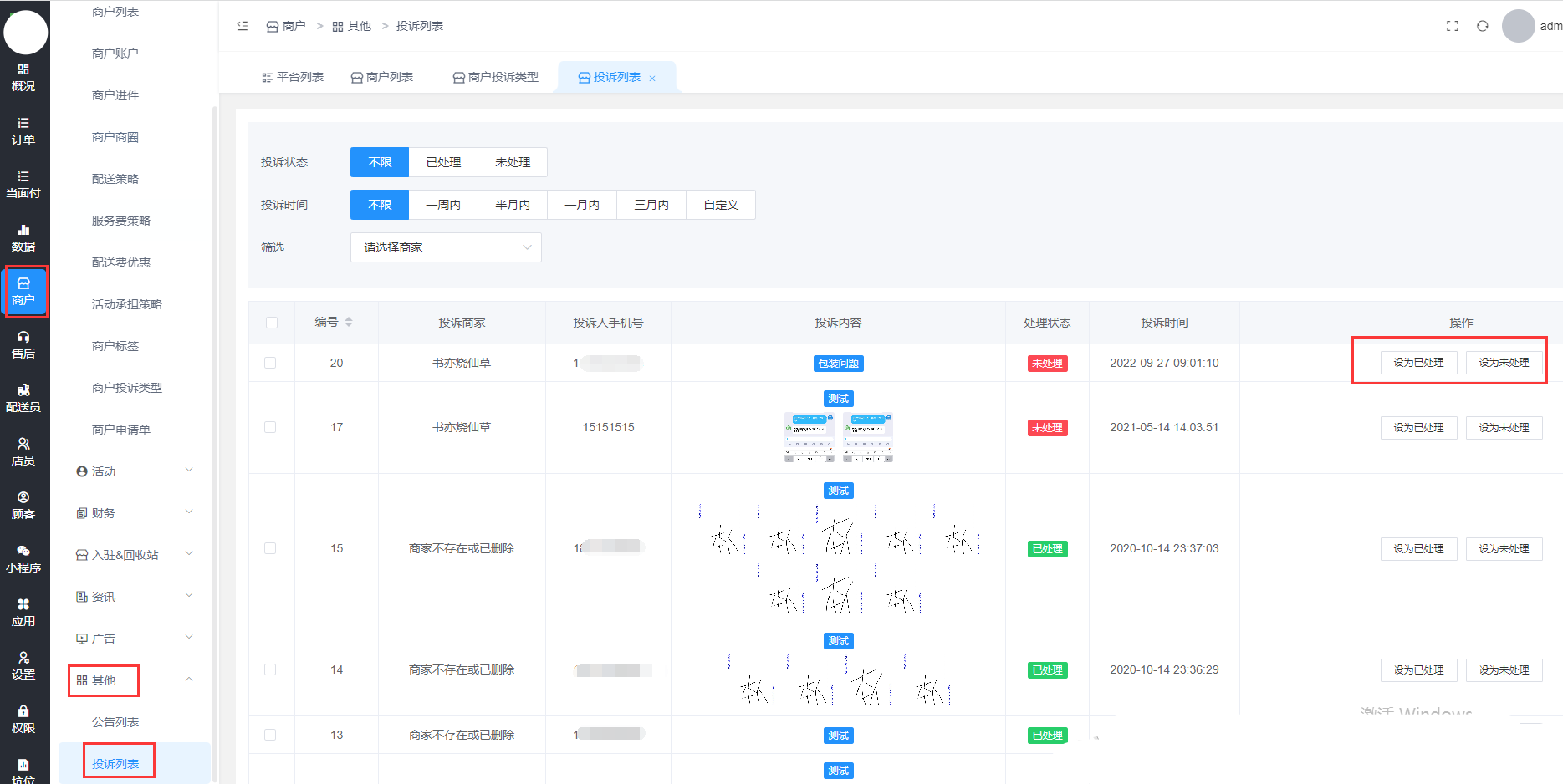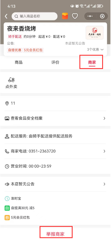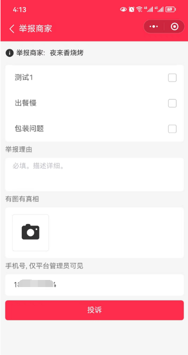 进入前端商家详情页,举报商家。注意: 这里的举报仅仅提交到平台,不会提交到微信官方。