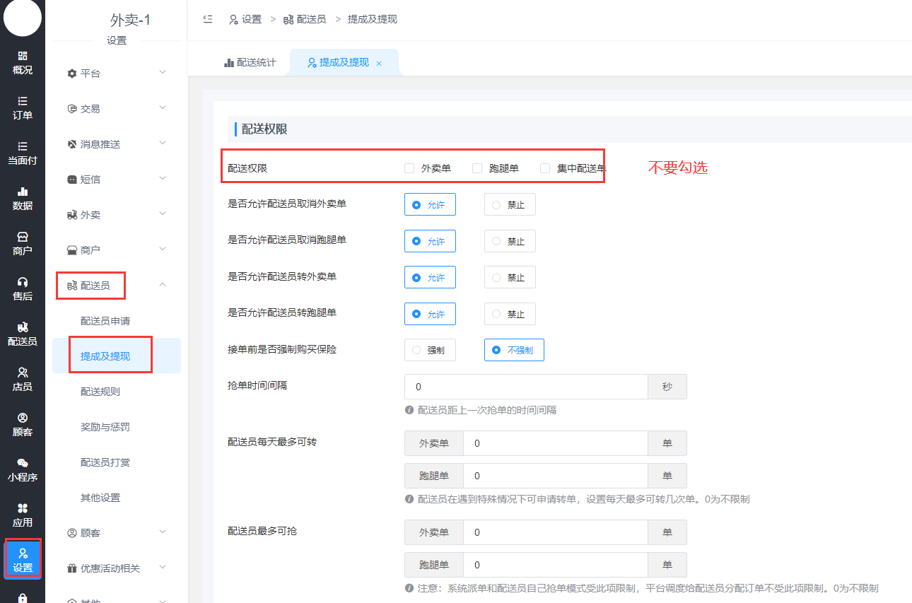 后台进入设置-配送员-提成及提现,配送权限不要勾选,提交保存