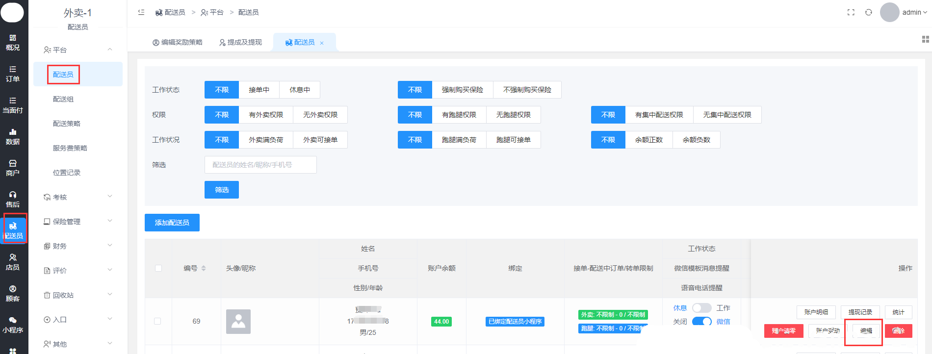 配送员-配送员列表-编辑,单独给某个配送员设置配送费提成