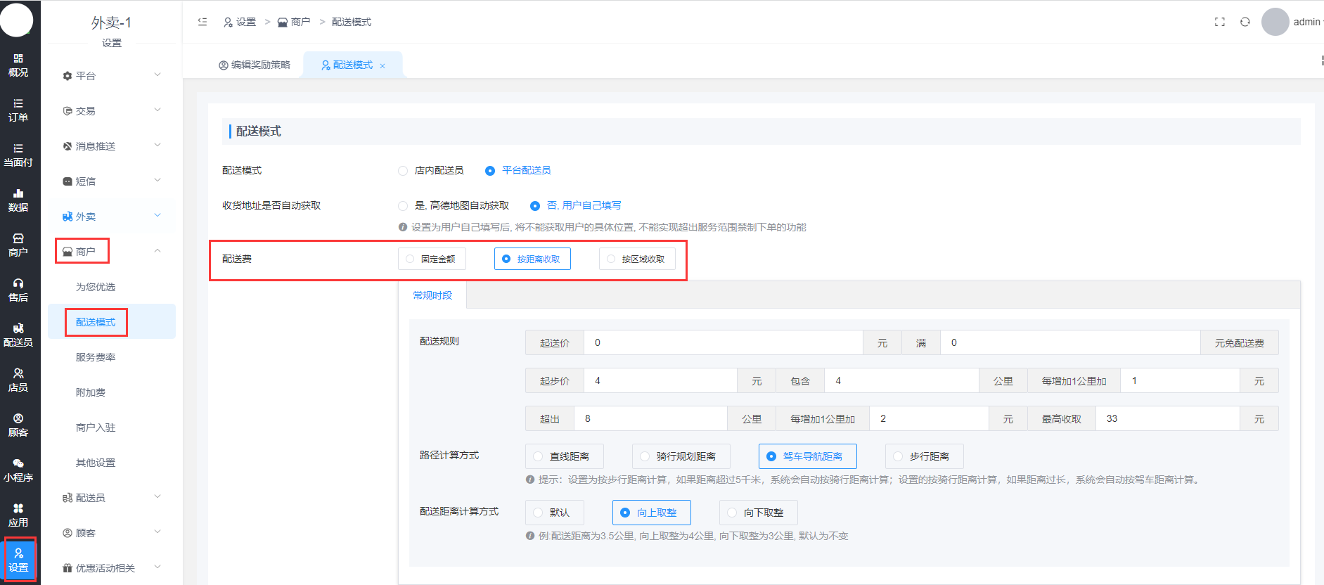 设置-商户-配送模式,可以批量设置收取顾客的配送费