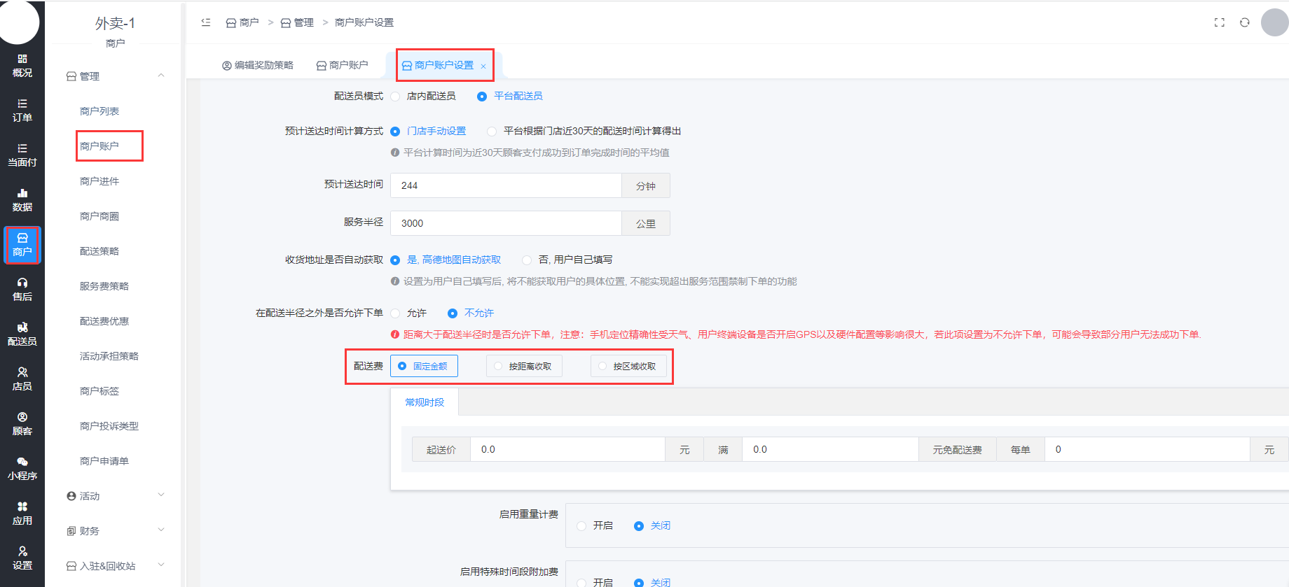商户-商户账户-账户设置,单独给某个商户设置收取顾客的配送费