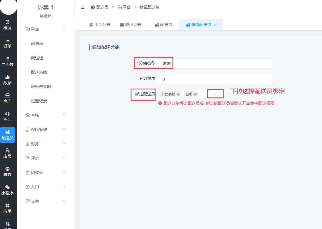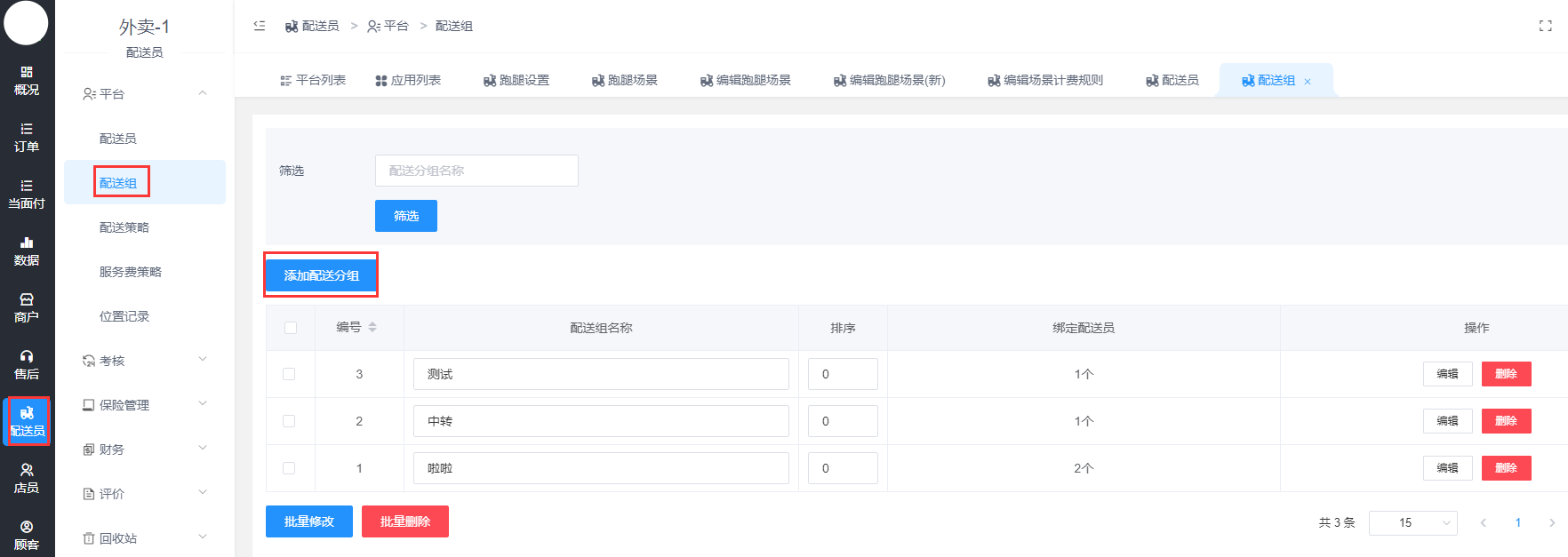 配送员-平台-配送组-添加配送分组,跑腿场景和多段配送插件里会用到配送分组。