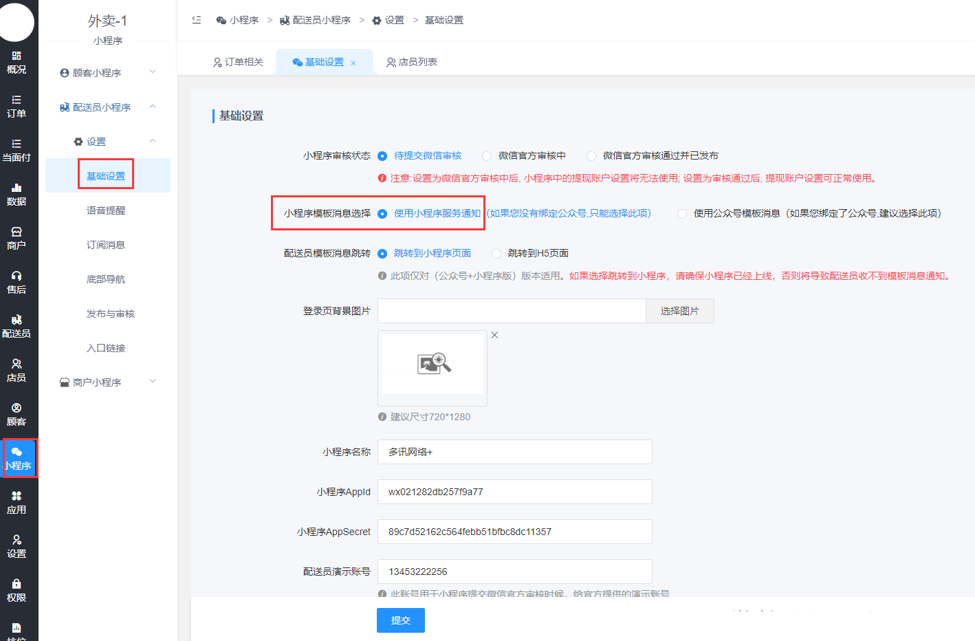 小程序-配送员/商户小程序-基础设置,小程序模板消息选择使用小程序服务通知