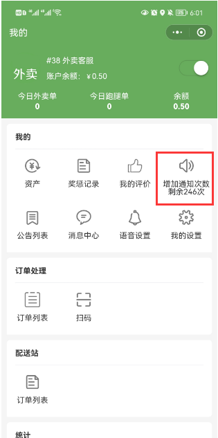 进入配送员/商户小程序,点击我的-增加通知次数,有通知次数才可以收到订阅消息通知。