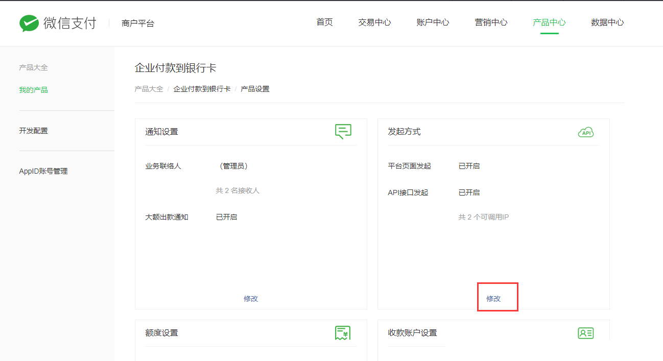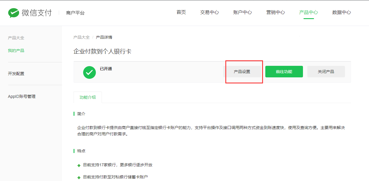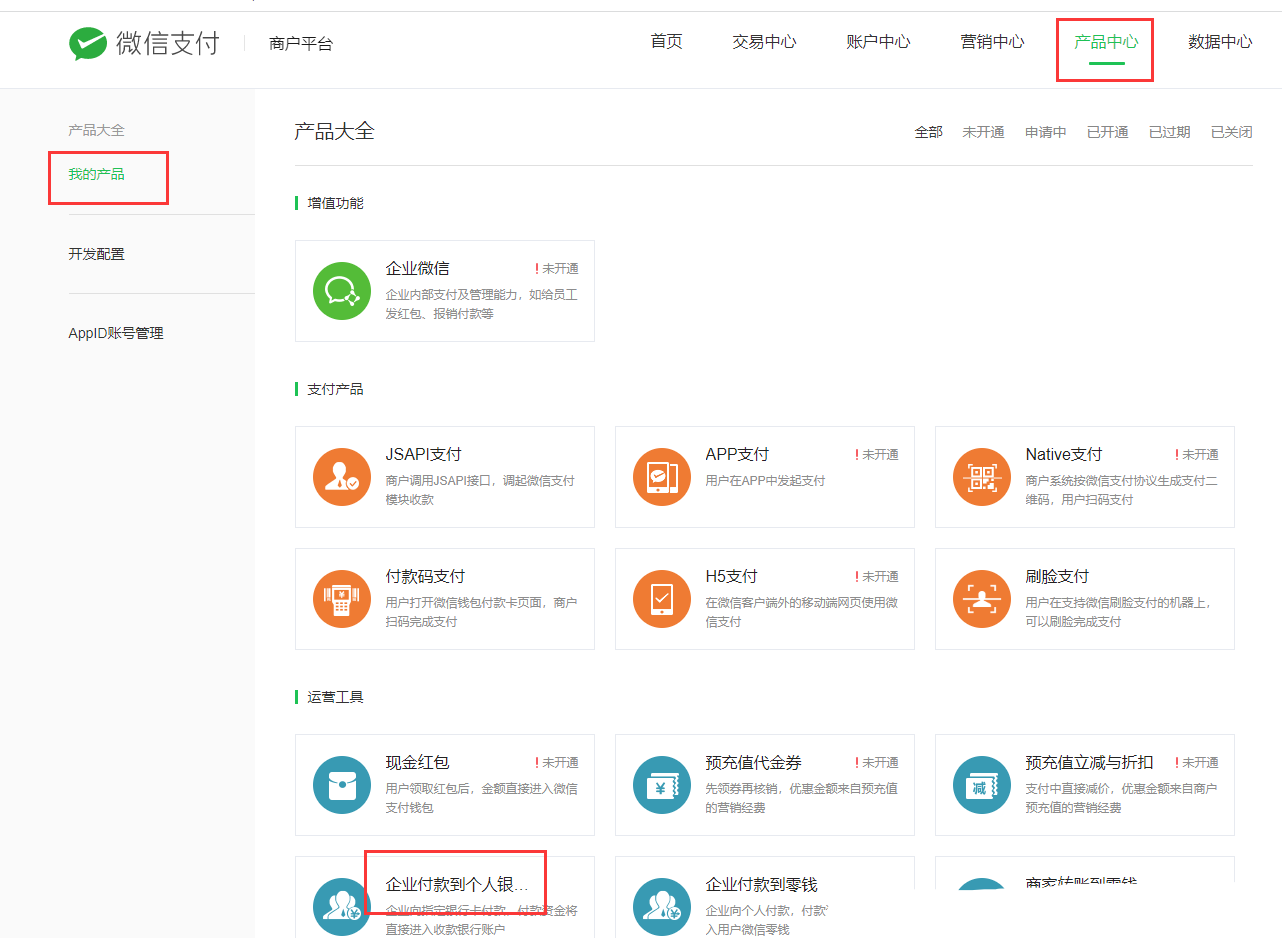 登录[微信支付商户后台](https://pay.weixin.qq.com/index.php/core/home/login?return_url=%2F),点击产品中心-我的产品,进入企业付款到个人银行卡权限