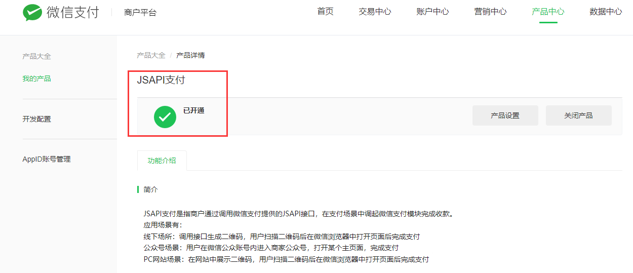 登录[微信支付商户后台](https://pay.weixin.qq.com/index.php/core/home/login?return_url=%2F), 产品中心-我的产品里,开通JSAPI支付,如下图