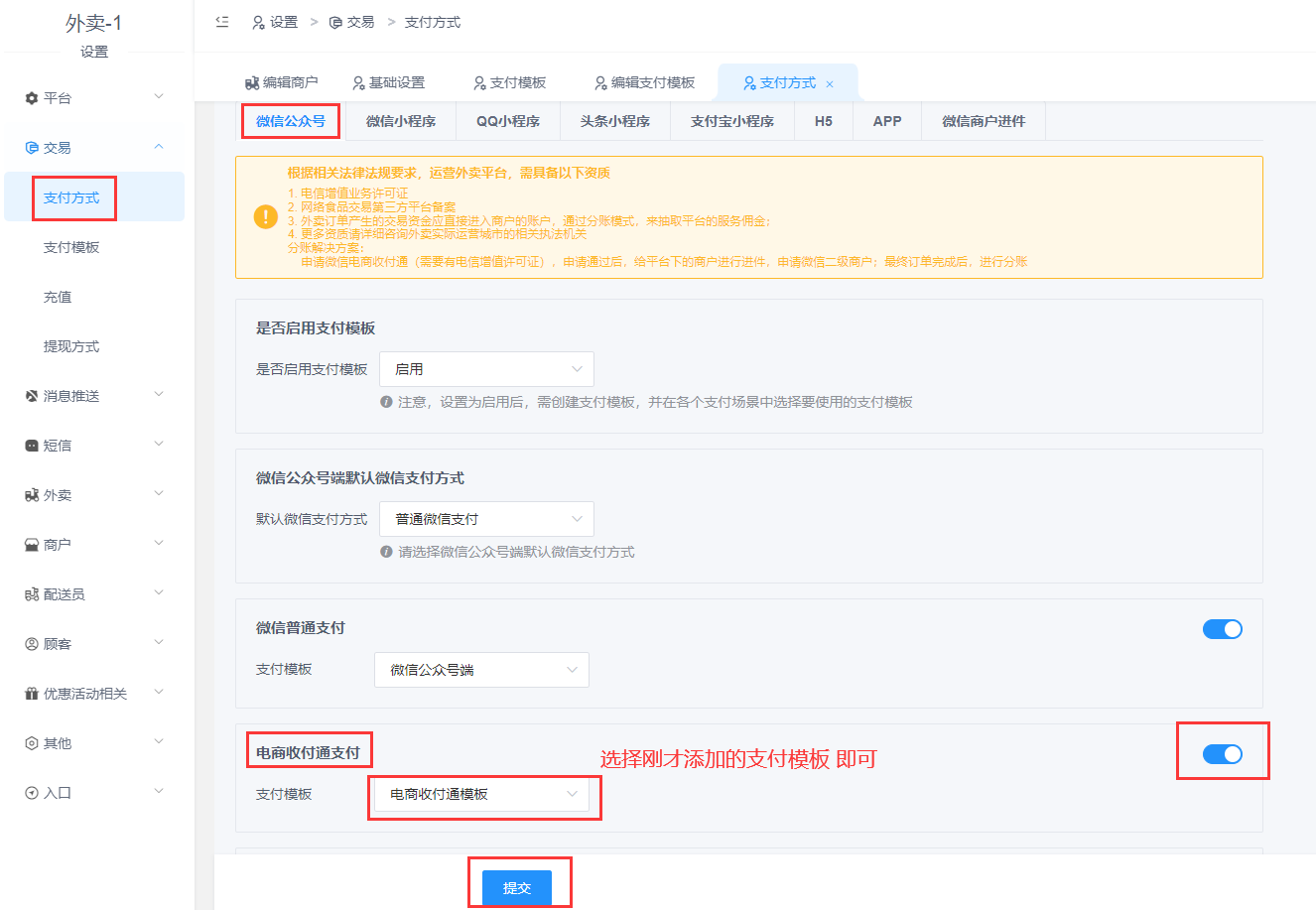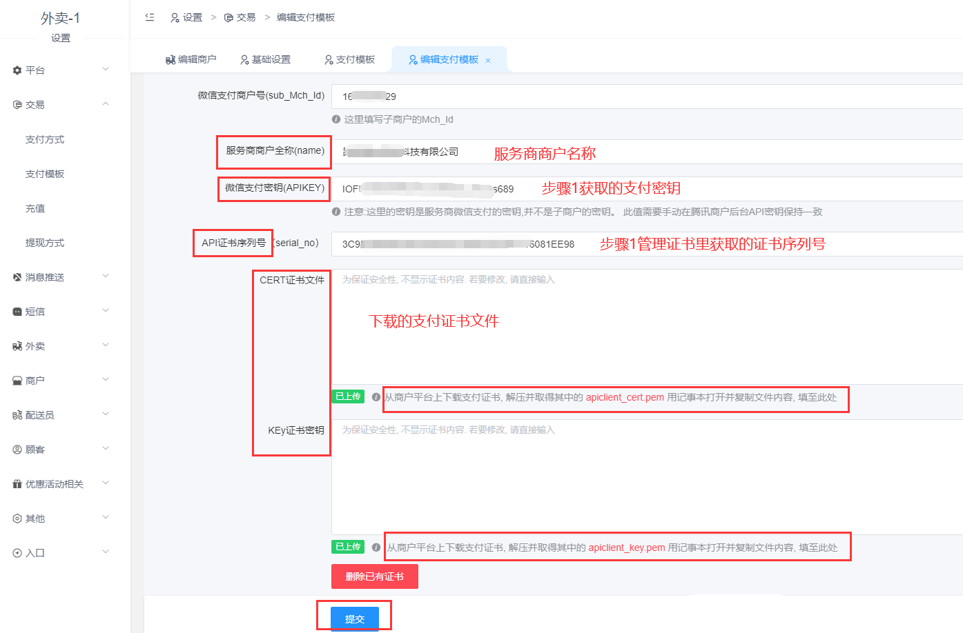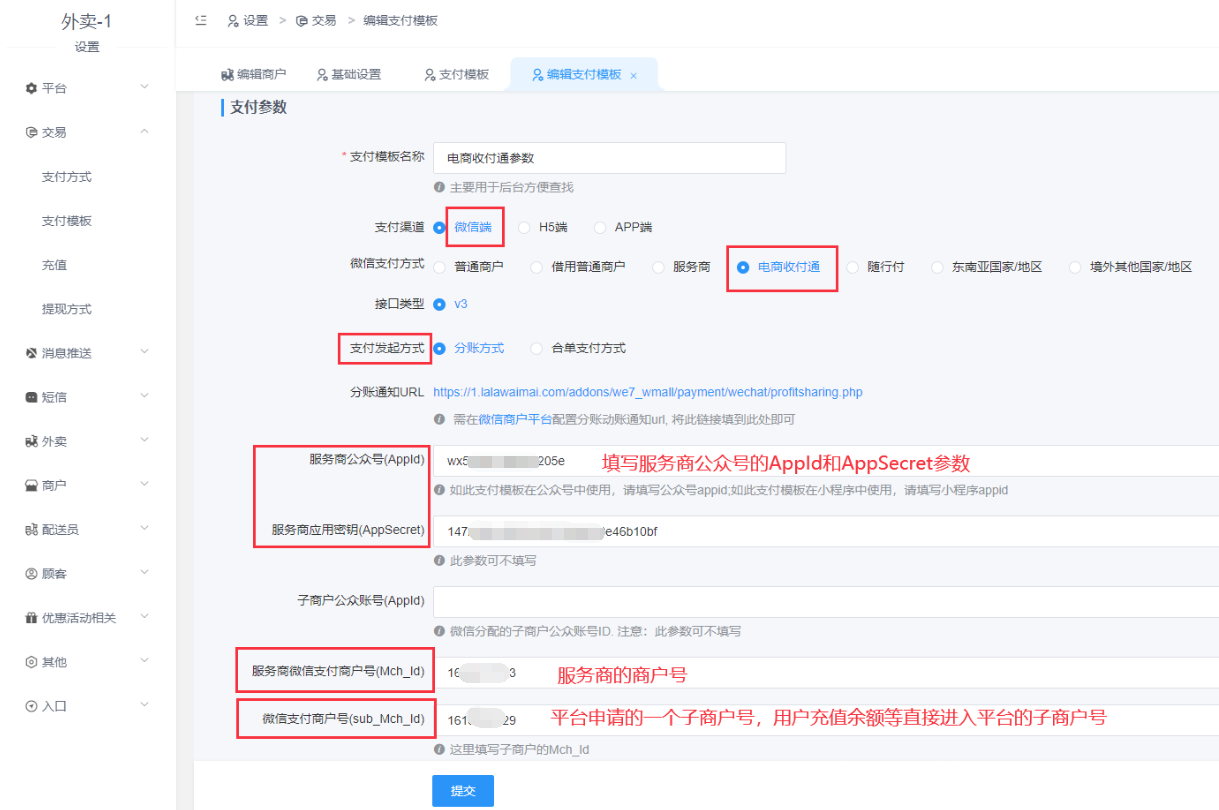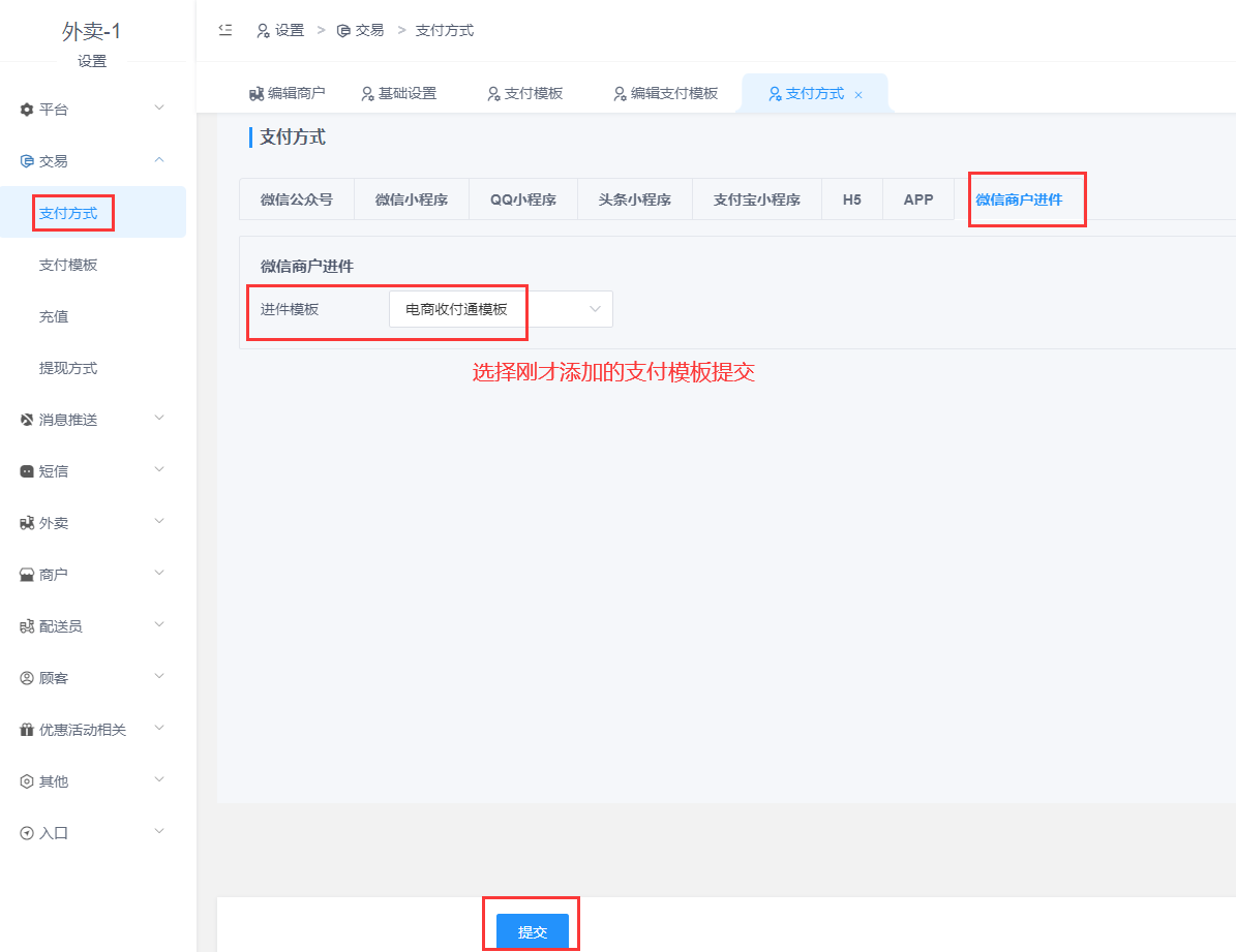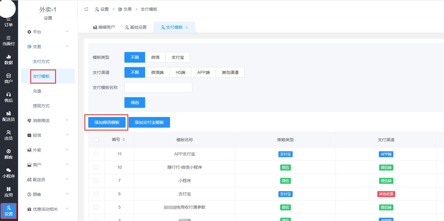 将以上步骤1准备好的参数以及文件配置到外卖后台: 设置-交易-支付模板