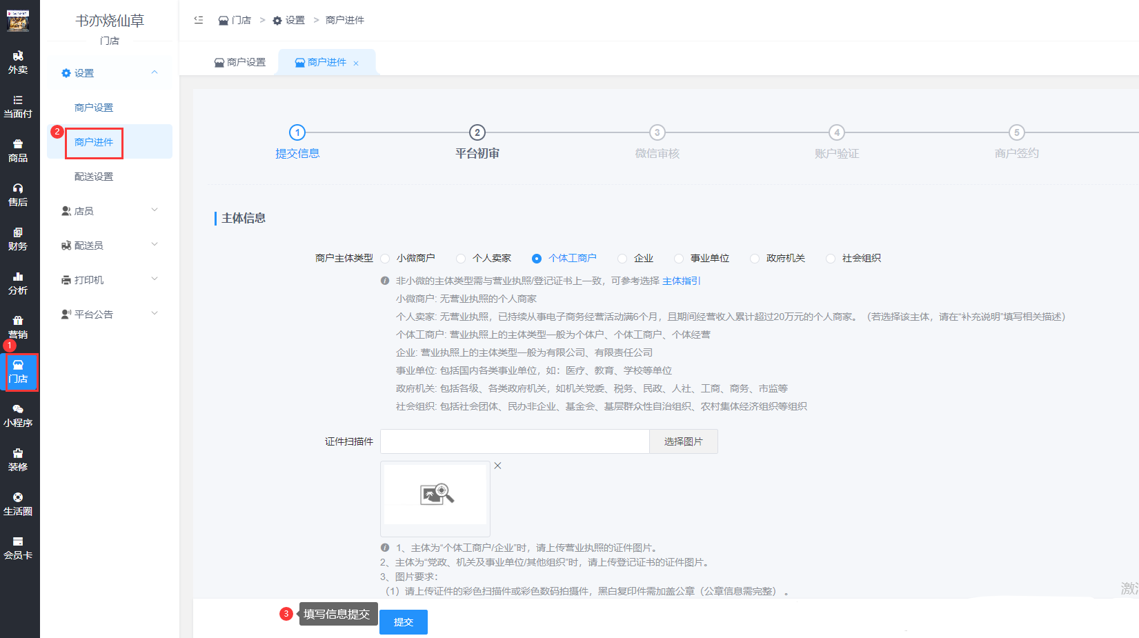 进入商户后台,门店-商户进件,填写基础信息,提交微信进件审核
