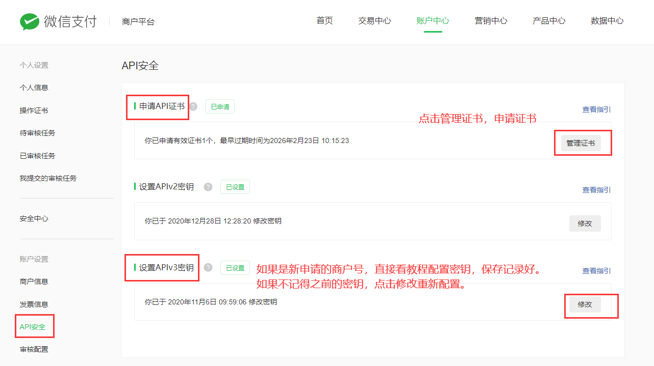## **1.3 微信支付密钥、API支付证书**
