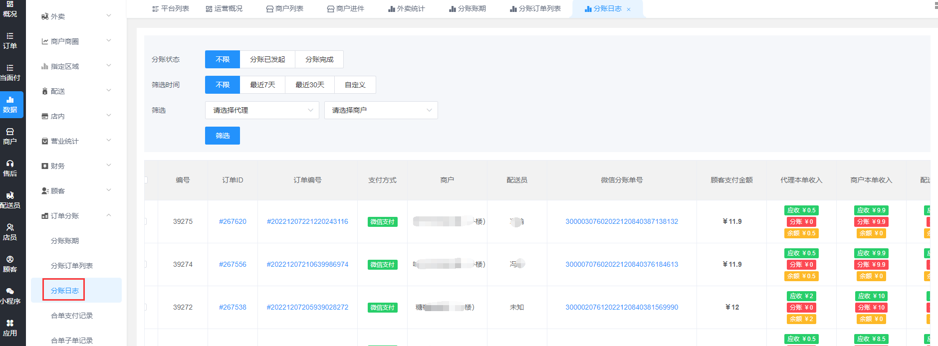 分账日志可以查看每一笔订单的分账详情