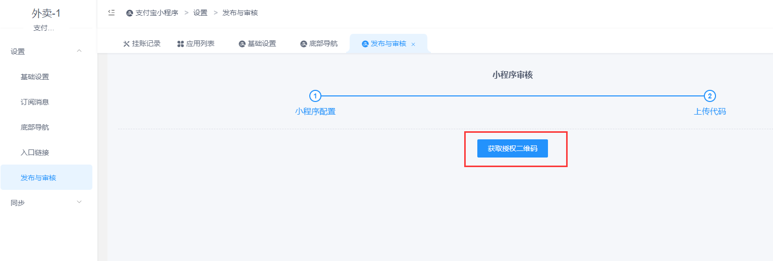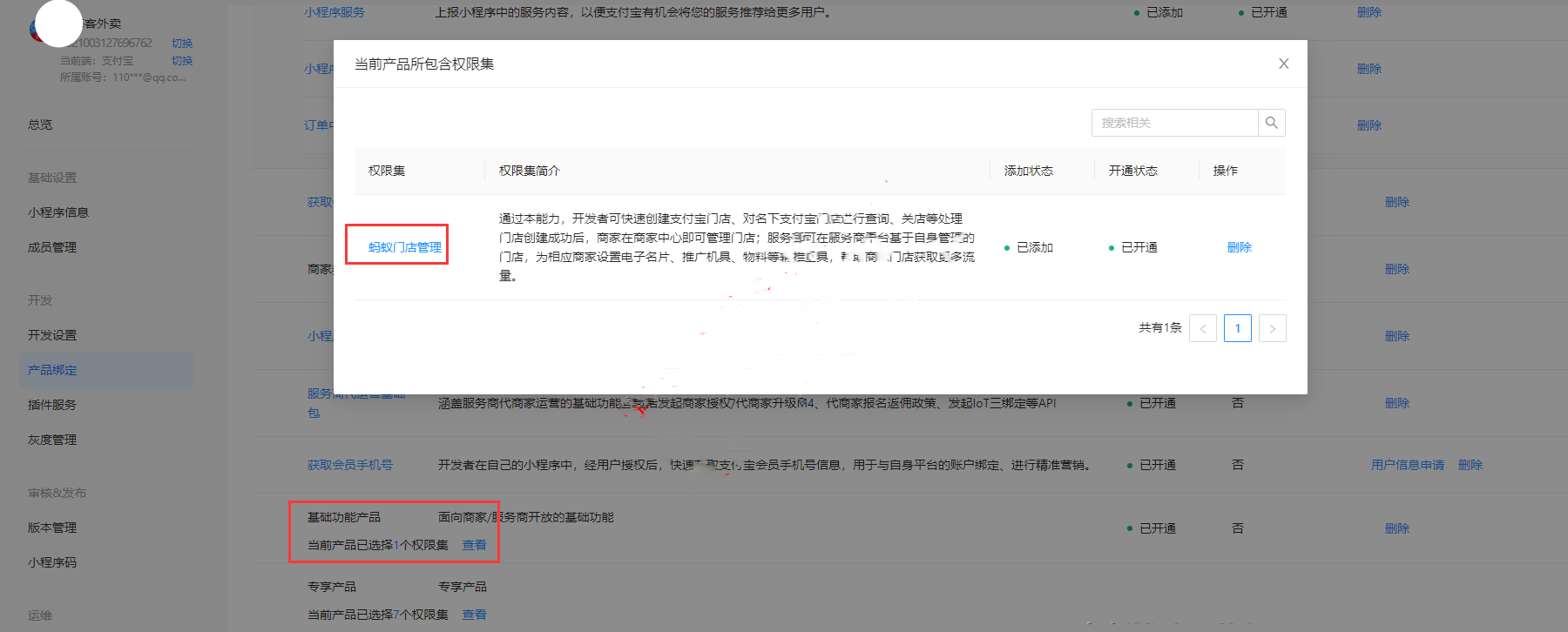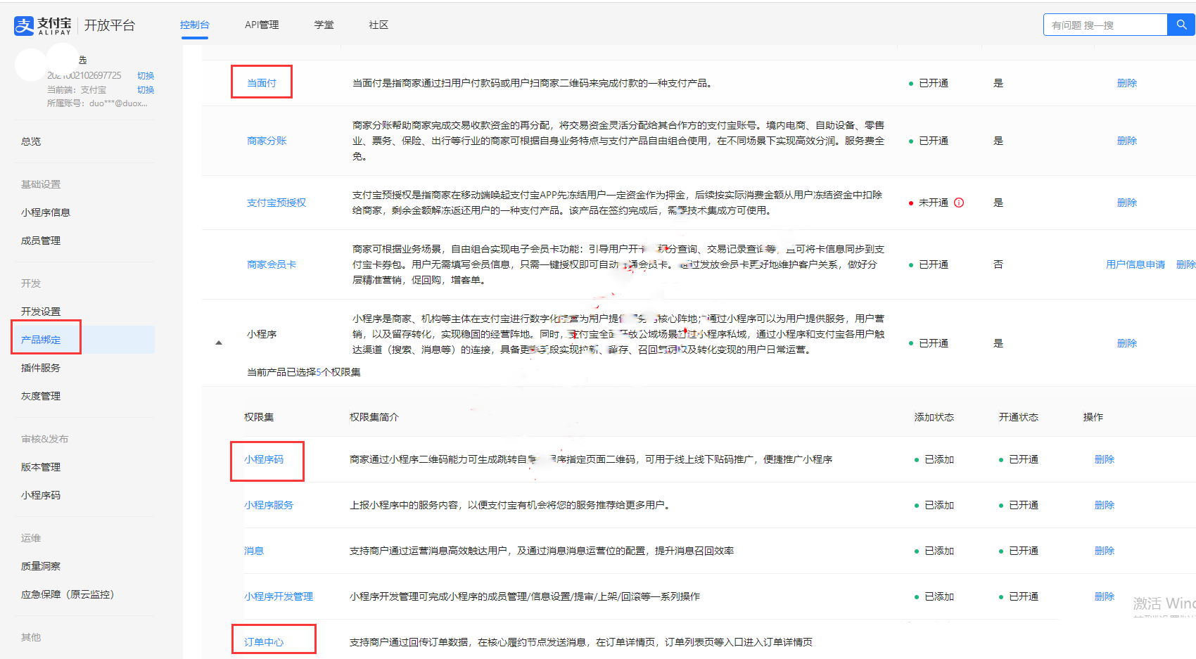 3.支付宝小程序产品绑定权限: 当面付、小程序订单中心、小程序码、蚂蚁