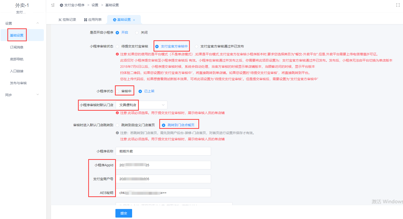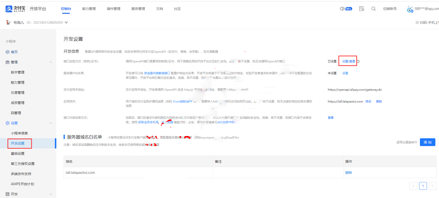填写小程序基础信息,提交。点击设置-开发设置,接口加签方式-设置,如下图: