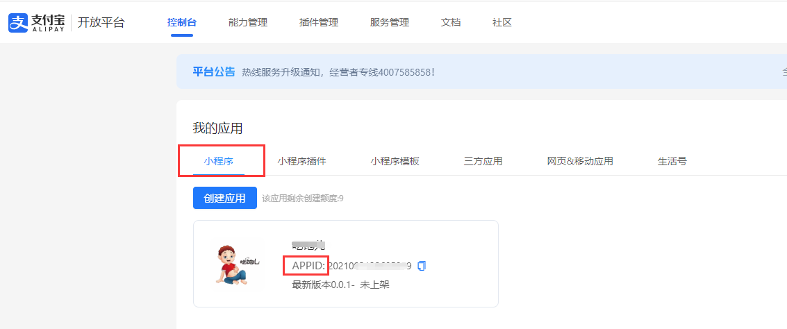 小程序appid获取,在支付宝后台[链接](https://auth.alipay.com/login/index.htm?goto=https%3A%2F%2Fwww.alipay.com%2F),如下图