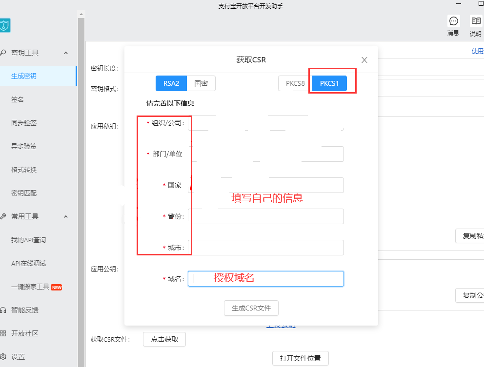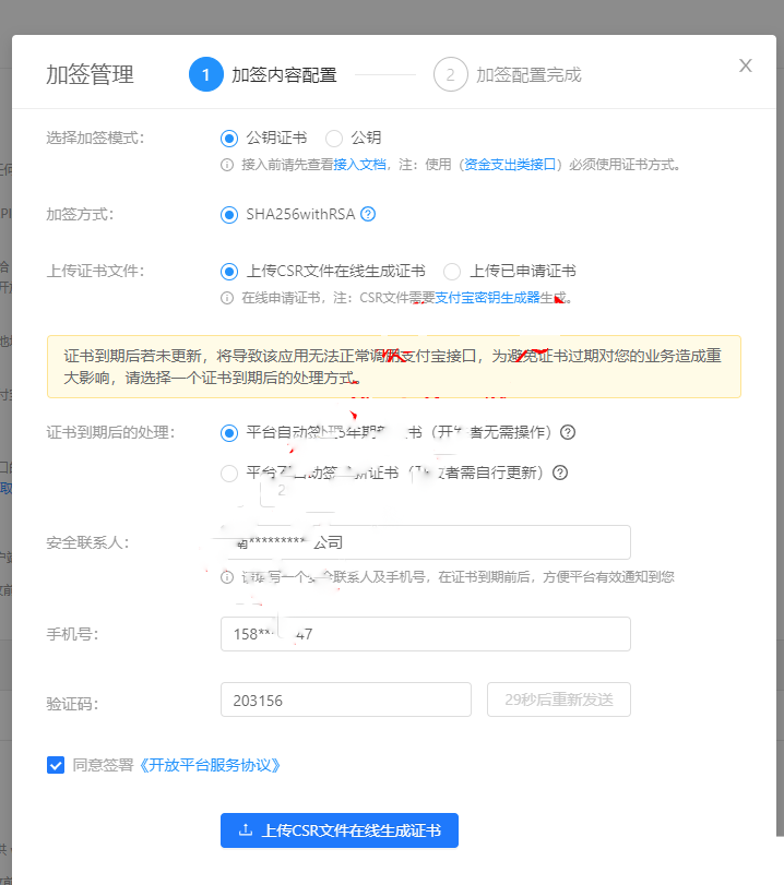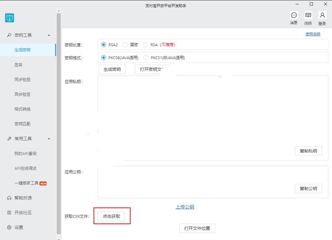 选择公钥证书模式,点击下载支付宝密钥生成器,生成CSR文件 (查看下面第1.1步)