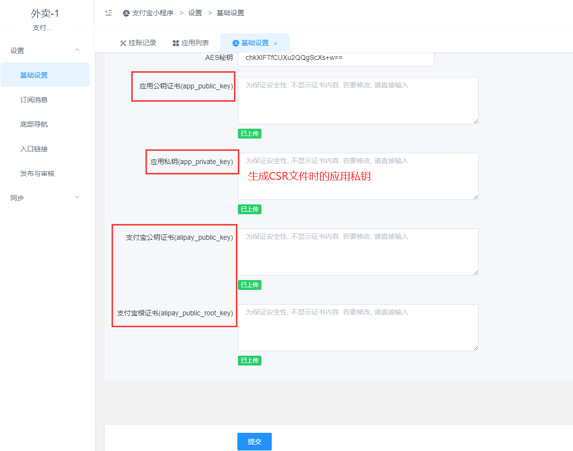 应用公钥证书、支付宝公钥证书、支付宝根证书和应用私钥证书对应上传即可。