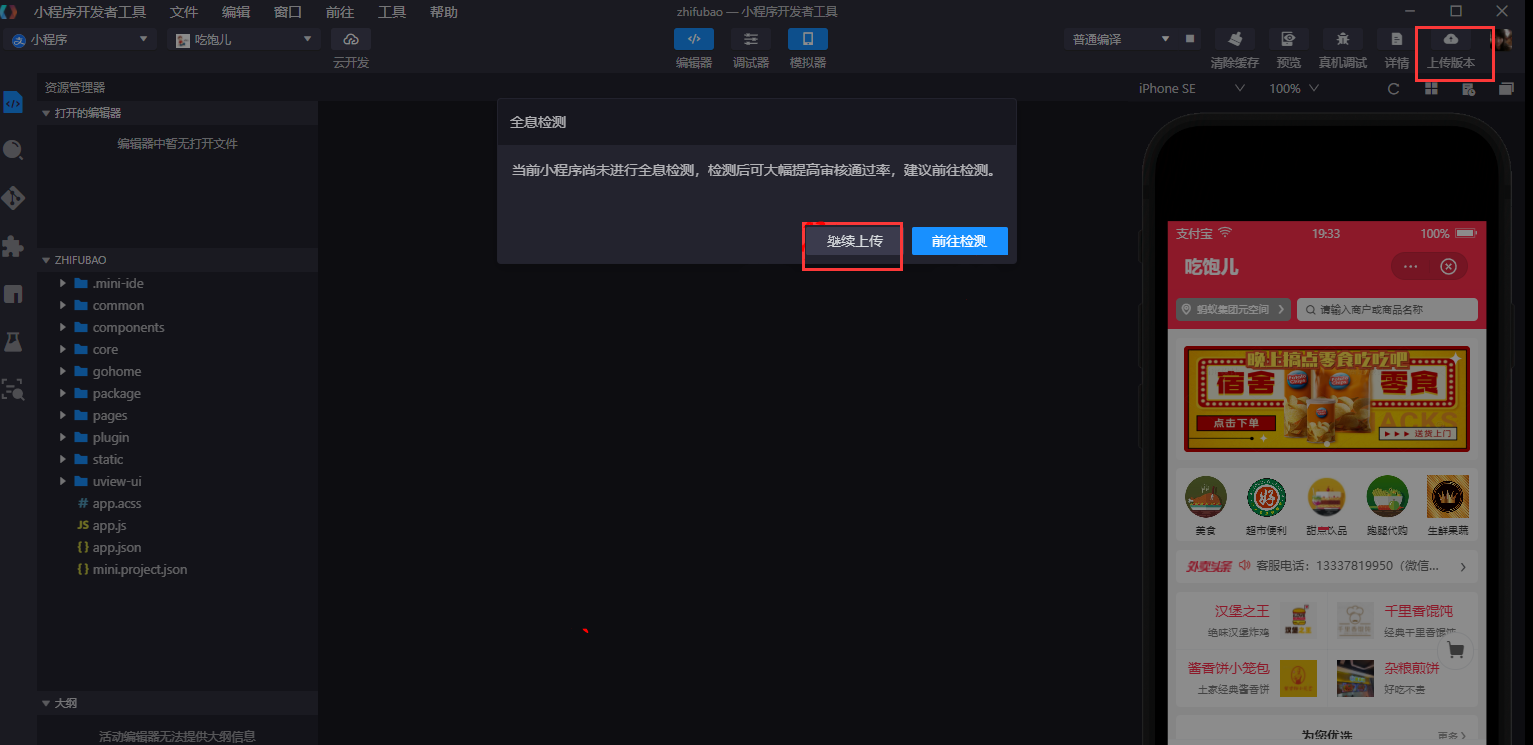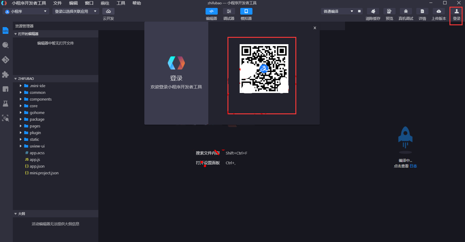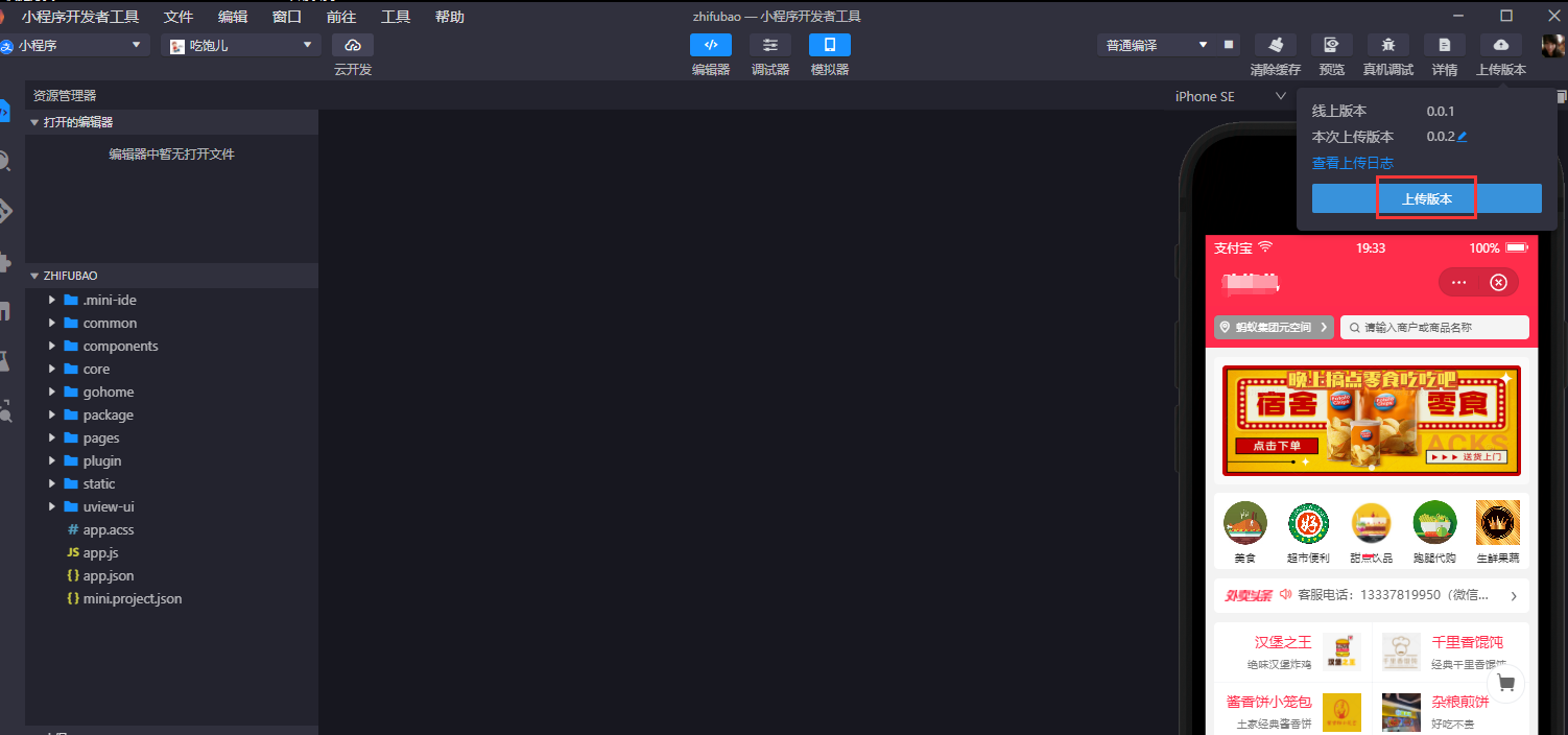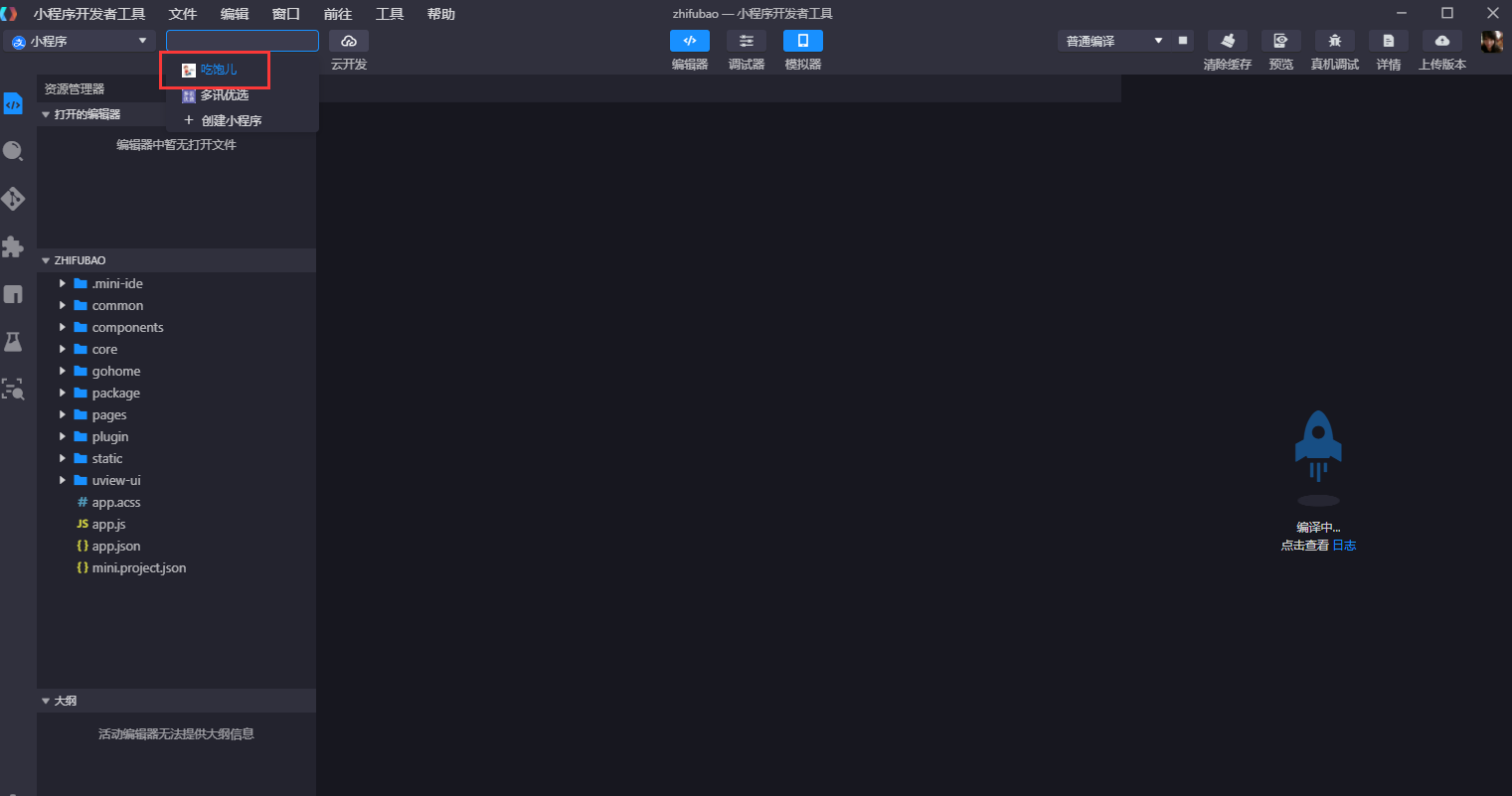 下载小程序开发者工具上传代码,下载地址[链接](https://opendocs.alipay.com/mini/ide/download)下载后打开小程序开发者工具,点击打开项目