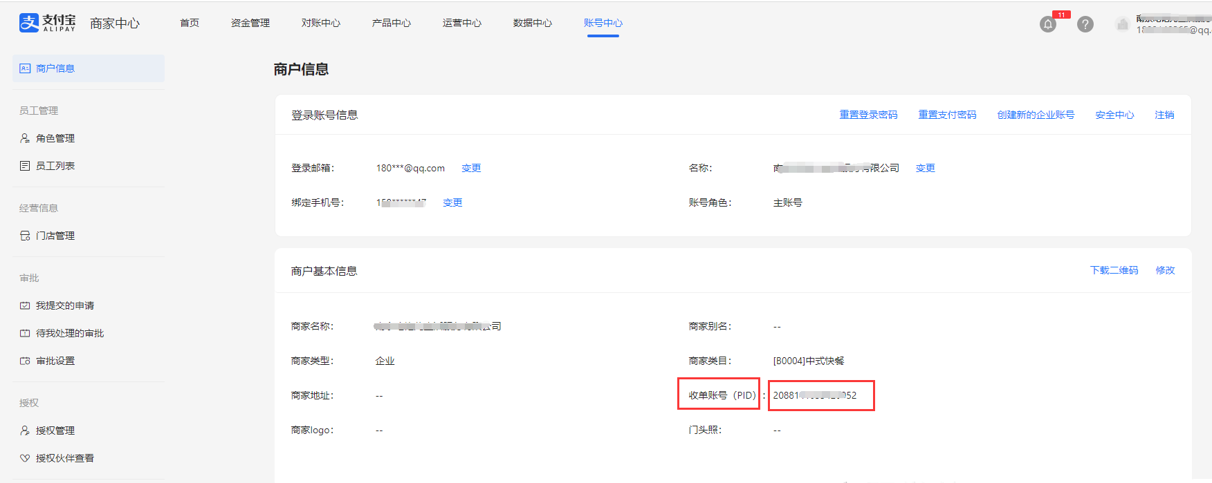 支付宝商户号获取,在支付宝后台[链接](https://auth.alipay.com/login/index.htm?goto=https%3A%2F%2Fwww.alipay.com%2F),如下图
