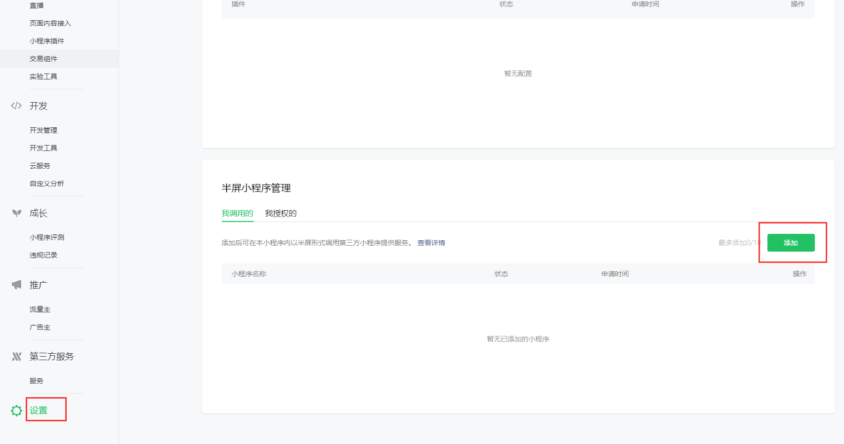 登录[微信公众平台](https://mp.weixin.qq.com/)小程序账号,设置-第三方设置-半屏小程序管理,添加
